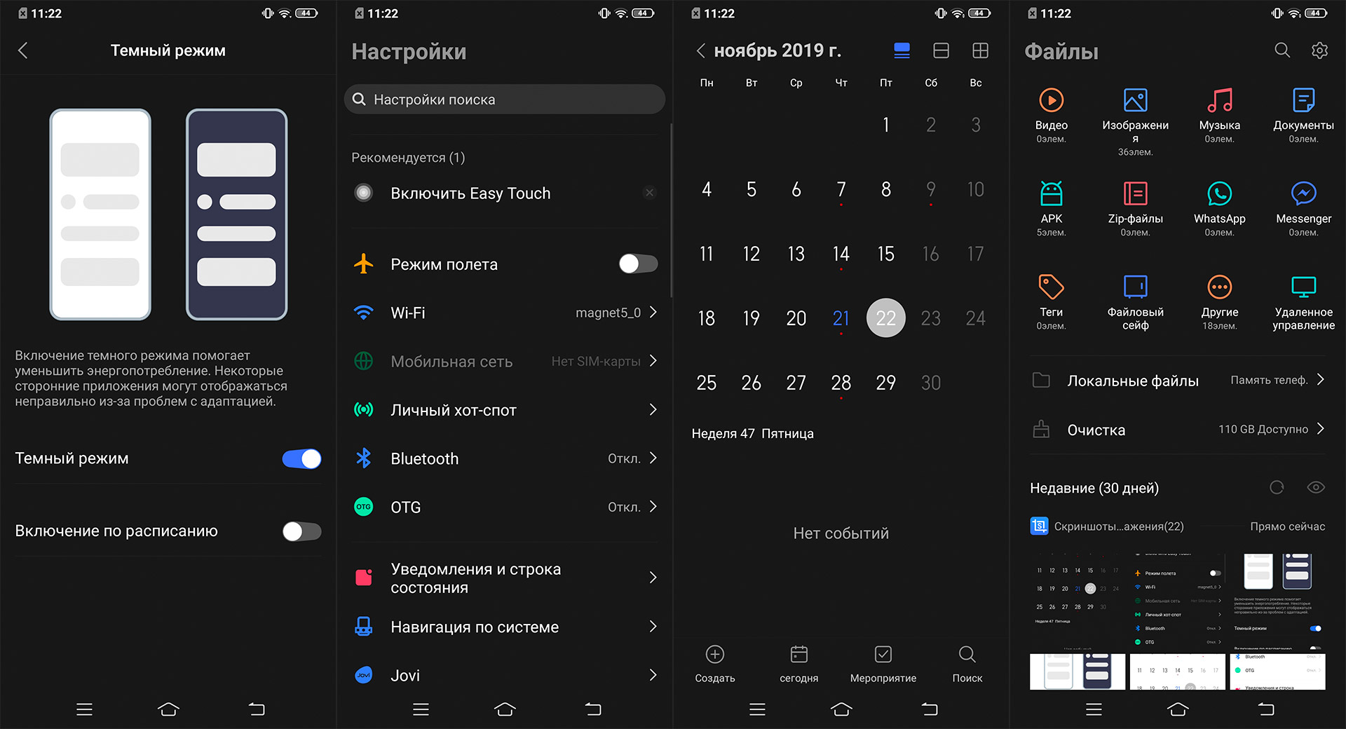 Powłoka zapewnia zestaw wstępnie zainstalowanych aplikacji. Uważam, że może się nieznacznie różnić w zależności od modelu. Ogólnie jest znany, ma wszystko, czego potrzebujesz. Odtwarzacz muzyki i wideo, menedżer smartfonów (z funkcją czyszczenia i innymi funkcjami serwisowymi), menedżer plików, kalkulator, dyktafon, tuner FM, notatki, klient poczty e-mail, własna usługa chmury vivo, kompas, poziom i EasyShare do szybkiego przesyłania treści, w tym bez mobilnego internetu lub wifi.