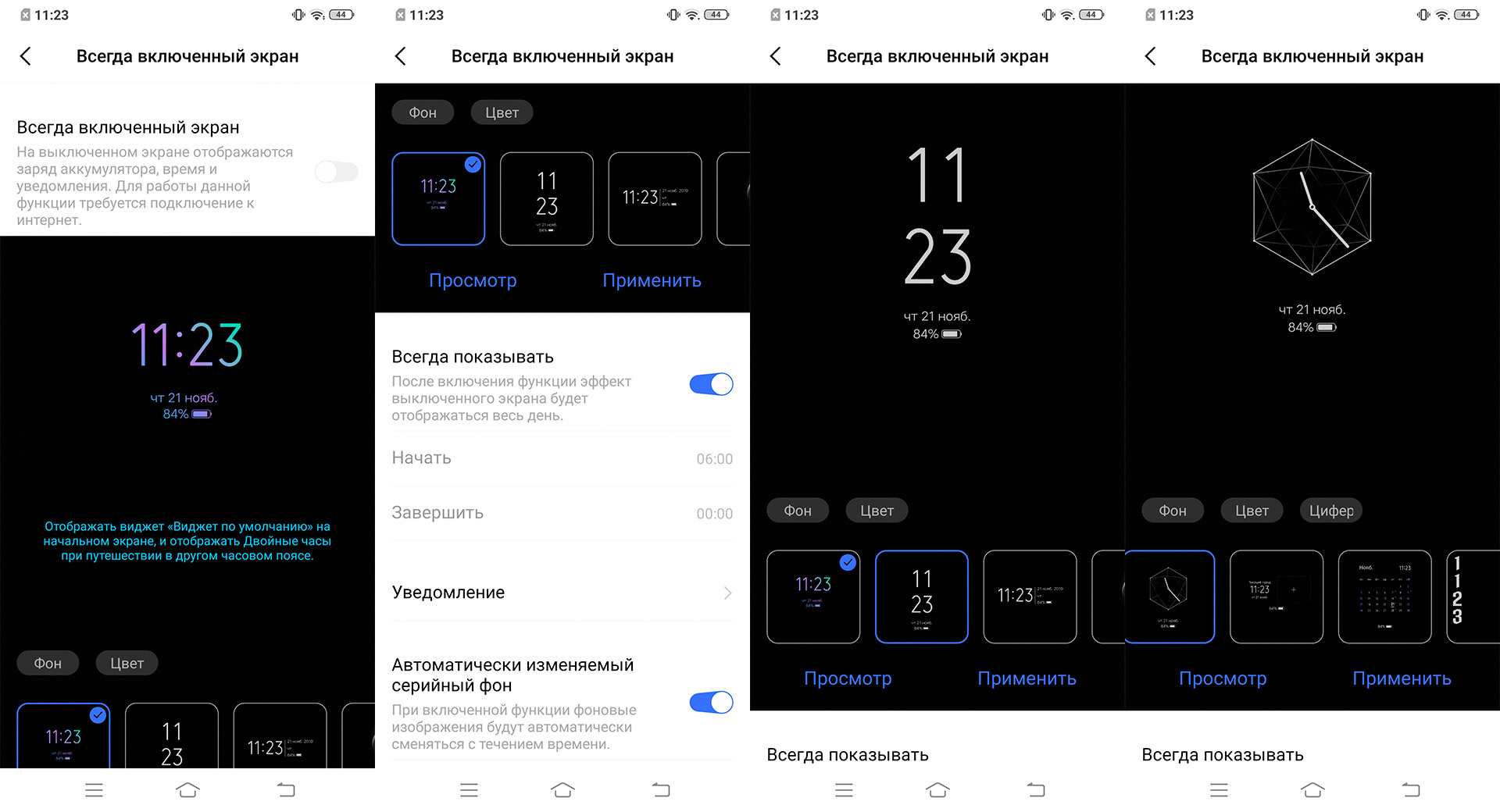 Modele z wyświetlaczami AMOLED mają funkcję Always on Display, która nie wymaga specjalnej prezentacji. Na ekranie będą wyświetlane godziny i powiadomienia. Istnieją różne opcje zegarków i ich kolorów.