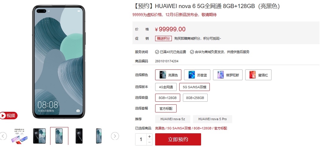 05 grudnia Huawei oficjalnie zaprezentuje swój nowy smartfon Nova 6. Jednak obecnie firma rozpoczęła przyjmować zamówienia wstępne w chińskim sklepie internetowym Vmall.