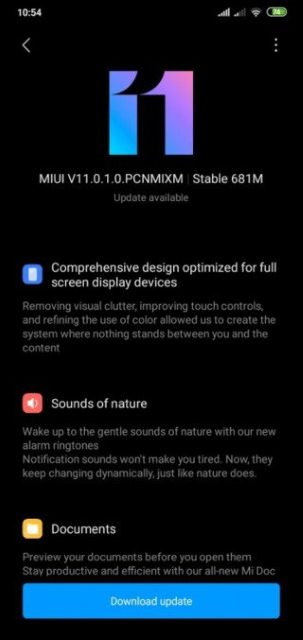 W oprogramowaniu układowym V11.0.1.0.PCNMIXM programiści dodali listopadową poprawkę bezpieczeństwa, funkcję Szybkie odpowiedzi, akcelerator graficzny Game Turbo i wszystkie główne innowacje powłoki MIUI 11. Na przykład zaktualizowany interfejs, nowe dzwonki z dźwiękami natury, pakiet funkcji i aplikacji Mi Work Suite i wiele innego.