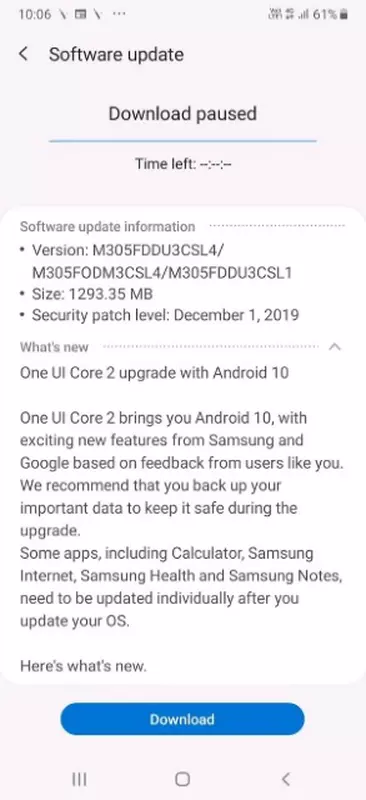 System wyszedł z kompilacją M205FDDU3CSL4 / M305FDDU3CSL4 i grudniową łatą bezpieczeństwa. Główną zmianą oprogramowania była zastrzeżona powłoka One UI 2.0 z nieznacznie zmienionym interfejsem, zaktualizowaną animacją do otwierania aplikacji, ulepszony tryb sterowania jedną ręką itp. Inni programiści dodali do oprogramowania nowe gesty kontrolne i ciemny motyw dla systemu i aplikacji.