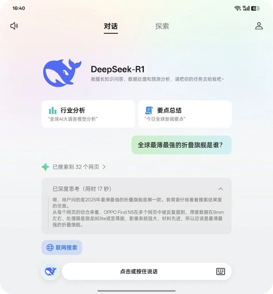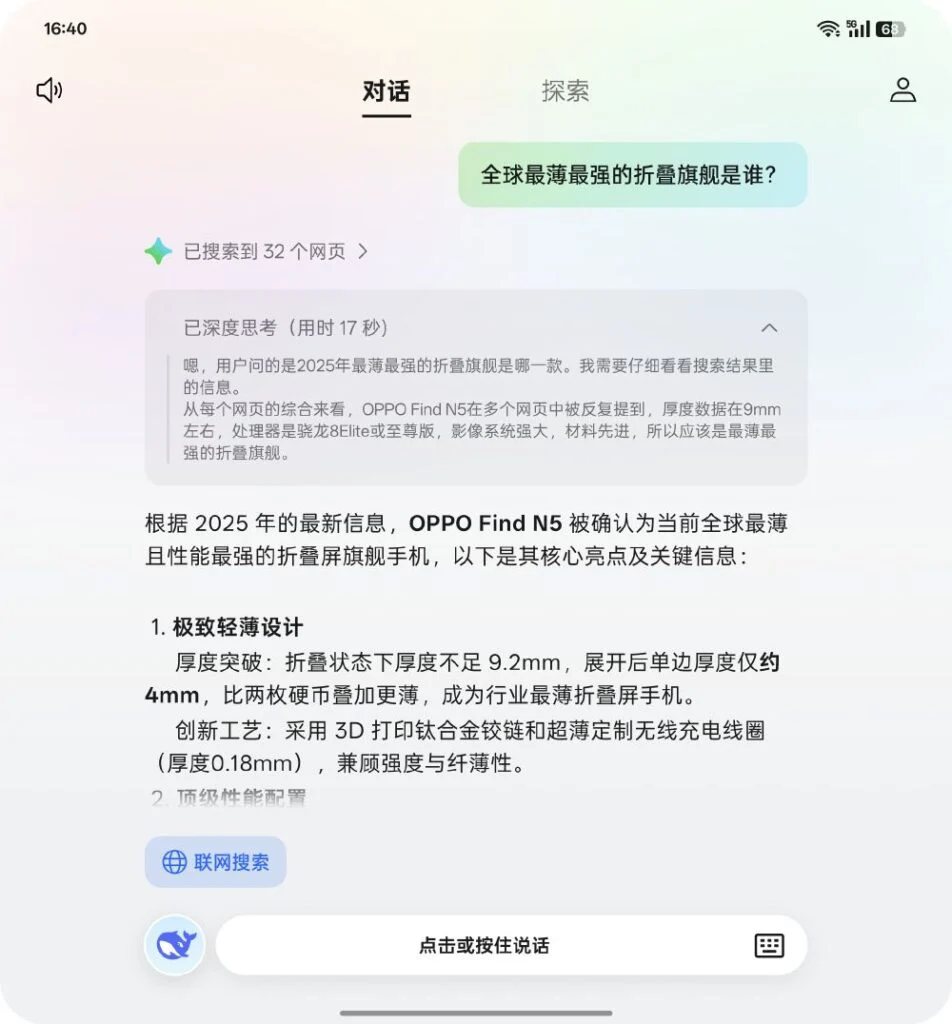 Oprócz podstawowych funkcji AI, DeepSeek-R1 na Find N5 pozwoli również na przeszukiwanie Internetu, dostarczając informacji w czasie rzeczywistym bez ręcznego wprowadzania danych. Sztuczna inteligencja będzie również w stanie generować i eksportować wyniki jako pliki lokalne, co pozwoli na przechowywanie i wygodne korzystanie z informacji.