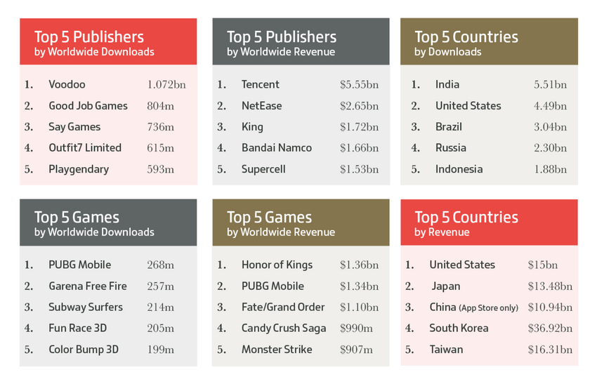 Najbogatszym wydawcą gier mobilnych był Tencent, który zarobił 5,55 miliarda dolarów. Mieszkańcy USA najwięcej wydali na gry, które „przyniosły” 15 miliardów dolarów na platformy mobilne. W tym samym czasie Indie wygrały pobrania - 5,51 miliarda pobrań.