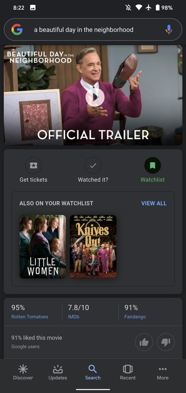 Jeśli poszukiwany przez użytkownika film lub serial znajduje się w YouTube lub Google Play, koszt jego obejrzenia i link pojawiają się obok przycisku Obejrzyj teraz. W przypadku premier, które nadal są wyświetlane w kinach, dostępny jest przycisk Pobierz bilety, który pozwala kupić bilet i wybrać miejsce i czas.