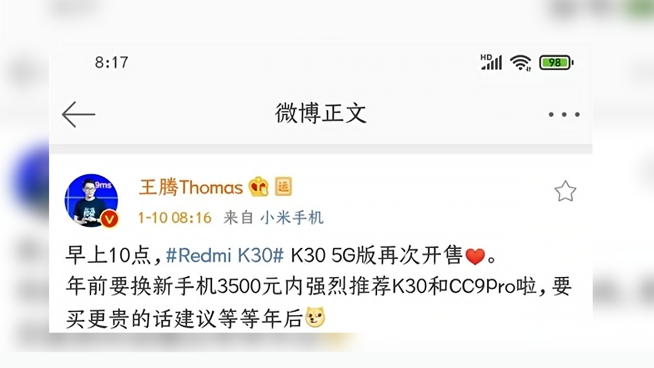 Teng napisał, że użytkownicy, którzy szukają smartfona za 505 USD, powinni wziąć Xiaomi Mi CC9 Pro lub Redmi K30. Wszyscy, którzy chcą drogiego urządzenia premium będą musieli czekać do końca roku zgodnie z chińskim kalendarzem. Być może Teng mówił o chińskim Nowym Roku, który odbędzie się 25 stycznia.