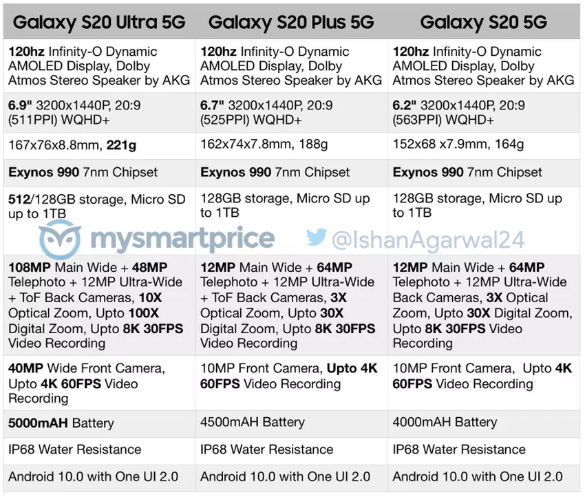 Słynny indyjski insider Ishan Agarwal (Ishan Agarwal) opublikował za miesiąc przed ogłoszeniem szczegółowe specyfikacje flagowych Galaxy S20, Galaxy S20 Plus i Galaxy S20 Ultra.