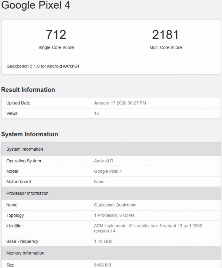 Jednak Geekbench przetestował Google Pixel 4 z 6 GB pamięci RAM i Androidem R. W rezultacie uzyskał 712 punktów w trybie jednordzeniowym i 2181 punktów w trybie wielordzeniowym.