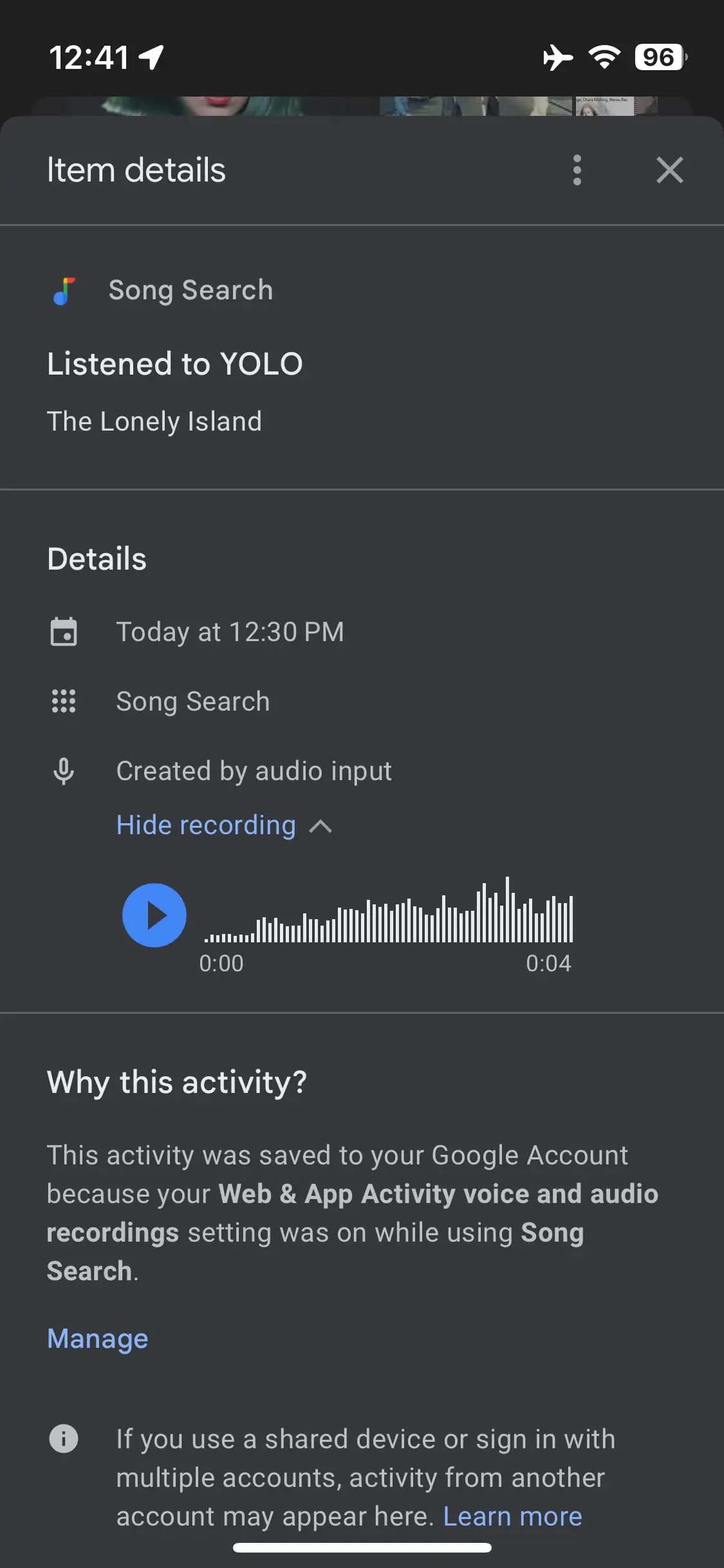 Na dole strony znajduje się przycisk "Pokaż pełną historię", który prowadzi do myactivity.google.com z filtrem "Wyszukiwanie piosenki". Okazuje się, że historia ta może być dostępna od dłuższego czasu - w niektórych przypadkach od 2017 roku. Nowsze wpisy zawierają również oryginalny plik audio użyty do wyszukiwania.