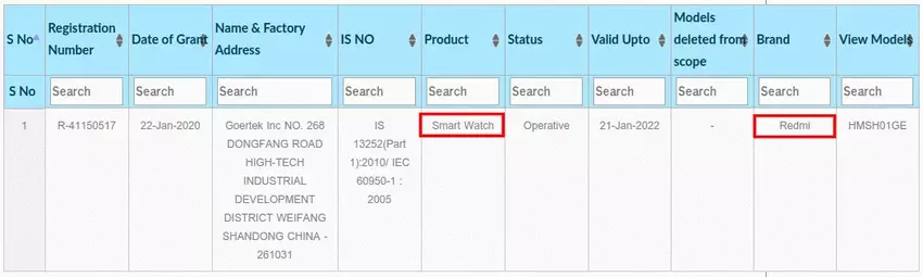 Tak więc Redmi otrzymało certyfikat od Bureau of Indian Standards na urządzenie o numerze modelu HMSH01GE. Nowość znajduje się w sekcji „Inteligentne zegarki”, w której zgrupowane są wszystkie urządzenia do noszenia.