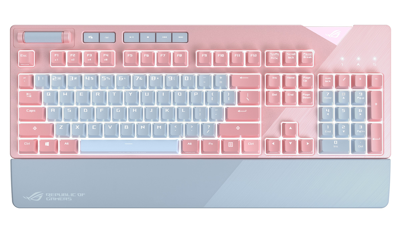 Z klawiatury poziomu podstawowego przejdź bezpośrednio na górę. Różowy ASUS ROG Strix Flare, oprócz oryginalnej kolorystyki i obsługi pędzla, również zadowoli kupującego jakością komponentów: klawiatura działa na oryginalnych niemieckich przełącznikach Cherry MX, które stały się rodzajem standardu. W obecności opcji Cherry MX Blue, Brown i Red, czarny, najwyraźniej nie dostarczono, co jest raczej dziwne, biorąc pod uwagę oczywisty nacisk na graczy; ROG Strix Flare oferuje nawet możliwość dodania własnego lub zespołowego logo do klawiatury na specjalnie wyróżnionym obszarze. Klawiatura ma również specjalne klawisze do kontrolowania głośności multimediów i dźwięku, wbudowaną pamięć i szerokie możliwości tworzenia makr, a także system podświetlenia Aura Sync.