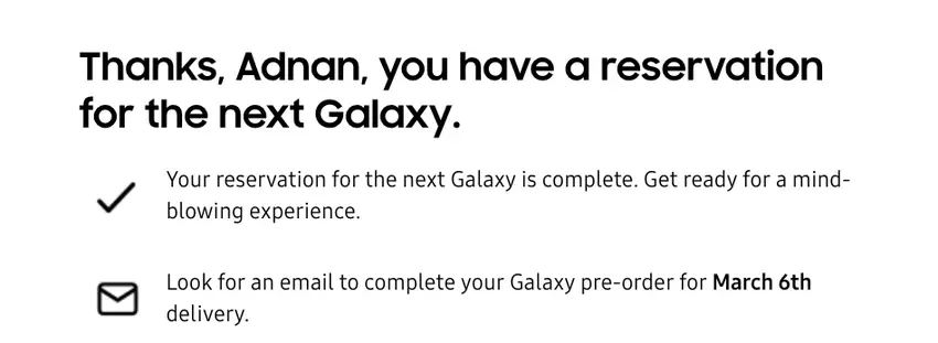 Możesz zarezerwować to miejsce na amerykańskiej stronie Samsunga, a na końcu zobaczysz podobny list, w którym 6 marca jest wydzielone pogrubioną czcionką że zamówienie będzie dostępne pod tą darą . Teraz przedstawiciele Samsunga już usunęli te informacje ze strony, ale autorowi udało się zapisać ją.