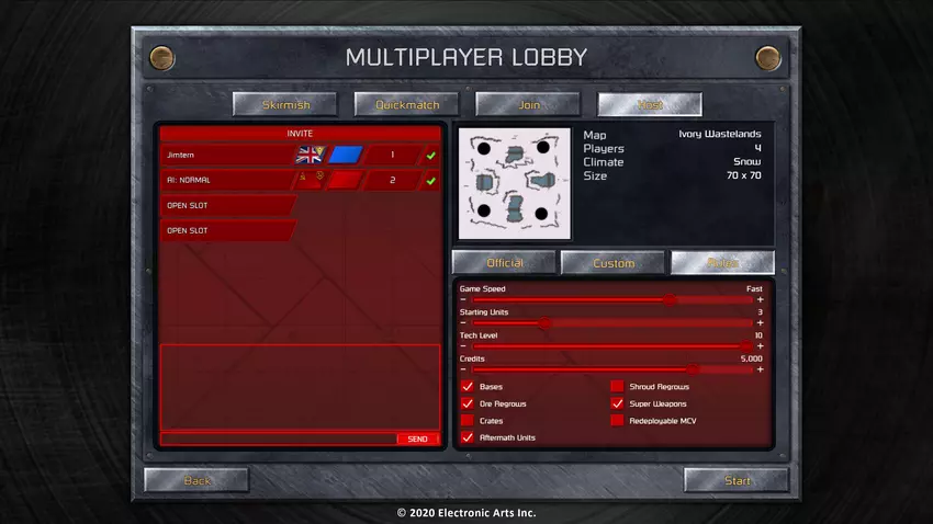 Przeciwnie, w meczach użytkowników pozwolą ci ustawić warunki. Na przykład, gracze będą mogli wskazać liczbę jednostek, początkowy zestaw zasobów, upuszczać skrzynki z losowymi nagrodami na polu bitwy i tak dalej. Dla wygody twórcy dodali nawet czat do lobby.