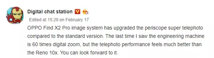 Informacje zostały udostępnione przez chińskiegoz insidera Digital Chat Station na jego stronie na Weibo. Nowość otrzyma lepszą kamerę niż zeszłoroczny flagowy OPPO Reno 10X Zoom. Według źródła będzie to zaktualizowany moduł peryskopowy z obsługą hybrydowego zoomu 60x. Dla porównania Galaxy S20 Plus obsługuje zoom 30x, a Galaxy S20 Ultra - 100x.