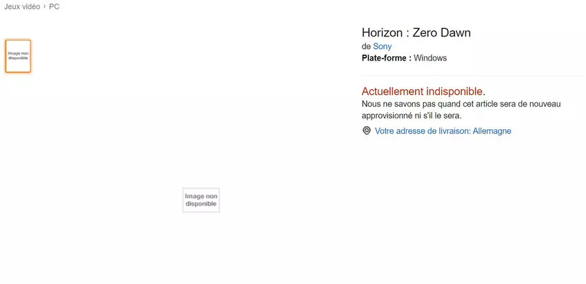 Strona Amazon Horizon Zero Dawn na PC pojawiła się na francuskim Amazon. Administracja zdążyła już usunąć wzmiankę o produkcie, ale użytkownikowi Twittera o pseudonimie Nibel udało się zapisać zrzut ekranu. Niestety, na stronie gry nie podano daty wydania i opisu, a tylko platformę i wydawcę. Ponieważ strona może być zwykłą „zasłonką”, którą Amazon stworzył a wszelki wypadek.