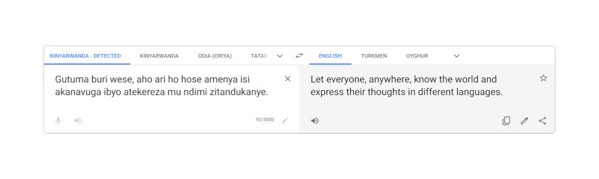Tłumacz Google ma teraz Kinyarwanda, Odia (Oriya), tatarski, turkmeński i ujgurski. W sumie z tych języków korzysta ponad 75 milionów ludzi na całym świecie, a po ich dodaniu lista Google Tranclate została rozszerzona do 108 języków.