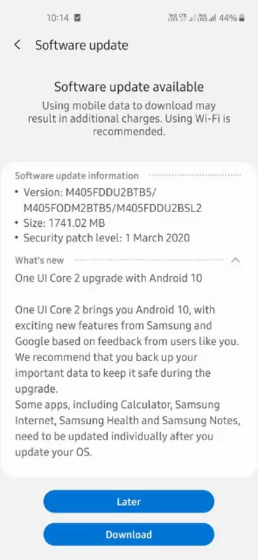 Urządzenie to trzecie urządzenie M-series po Galaxy M20 i M30 Galaxy, która otrzymała najnowszy SO. System posiada numer kompilacji M405FDDU2BTB5 i waży około 1,7 GB.