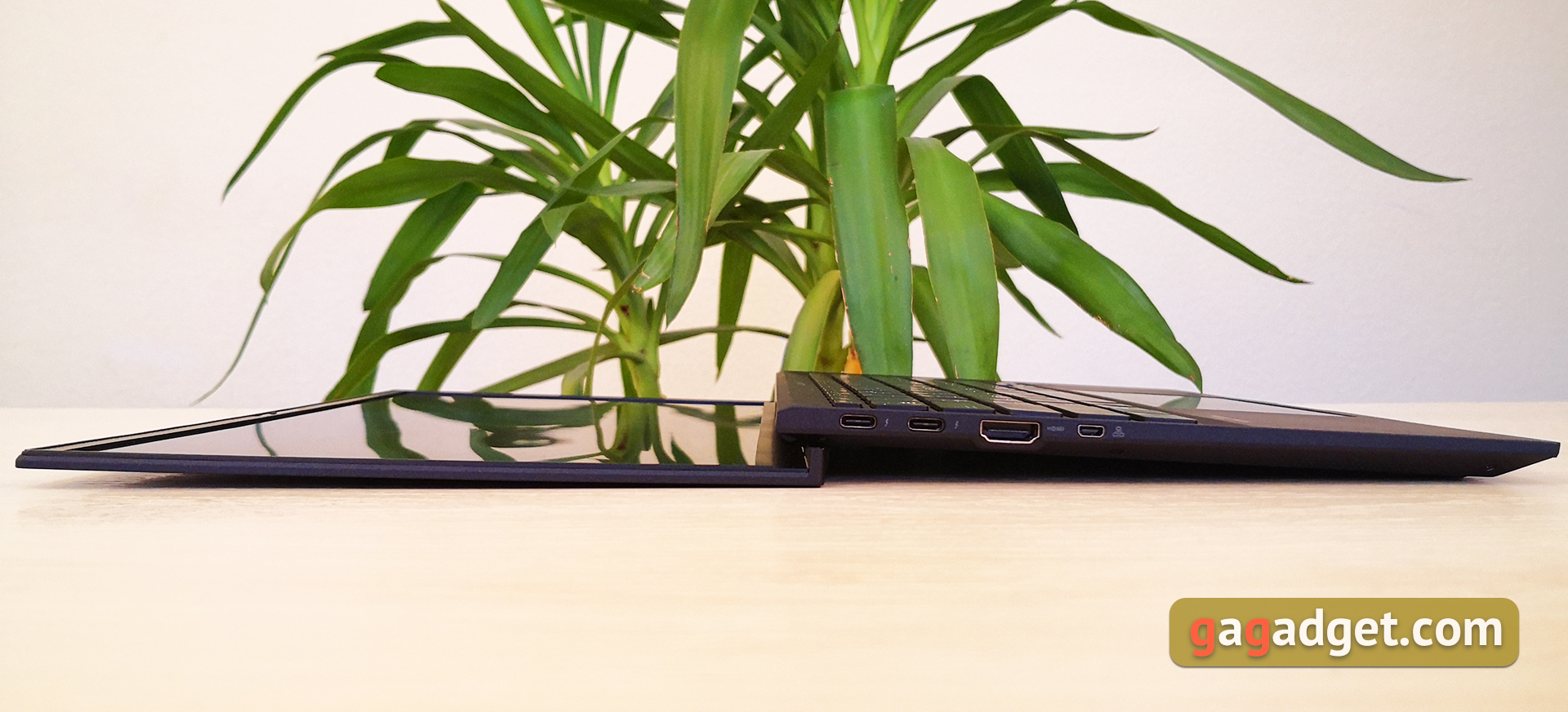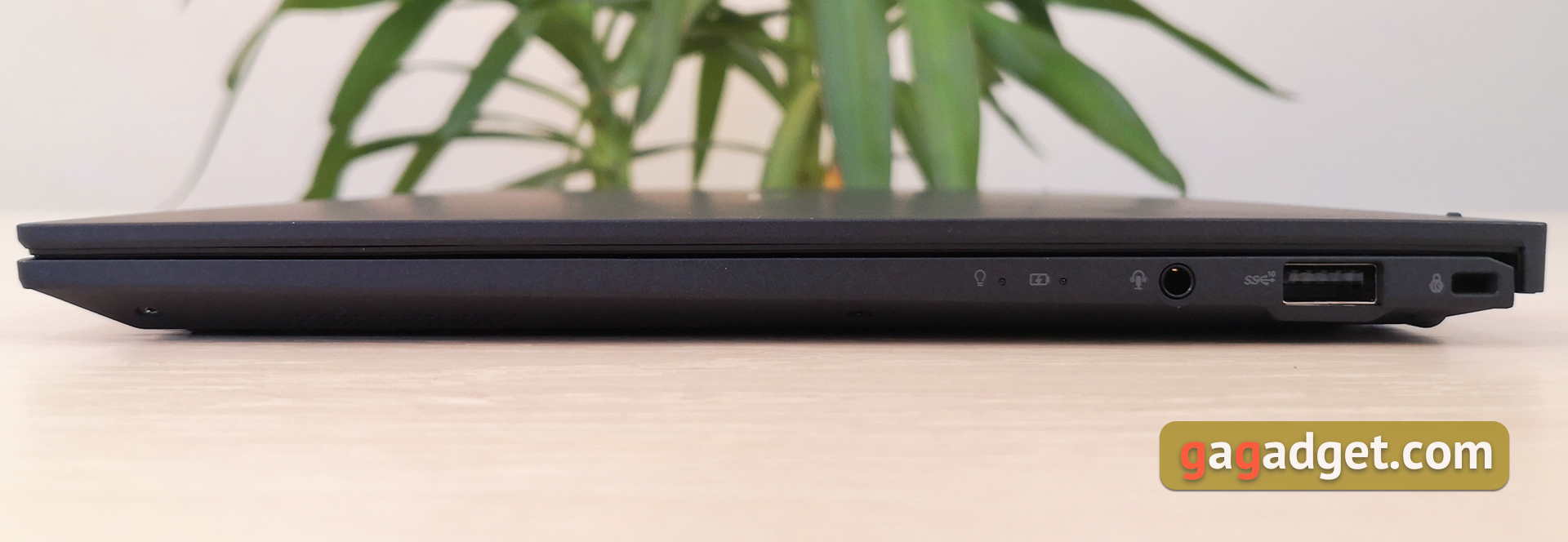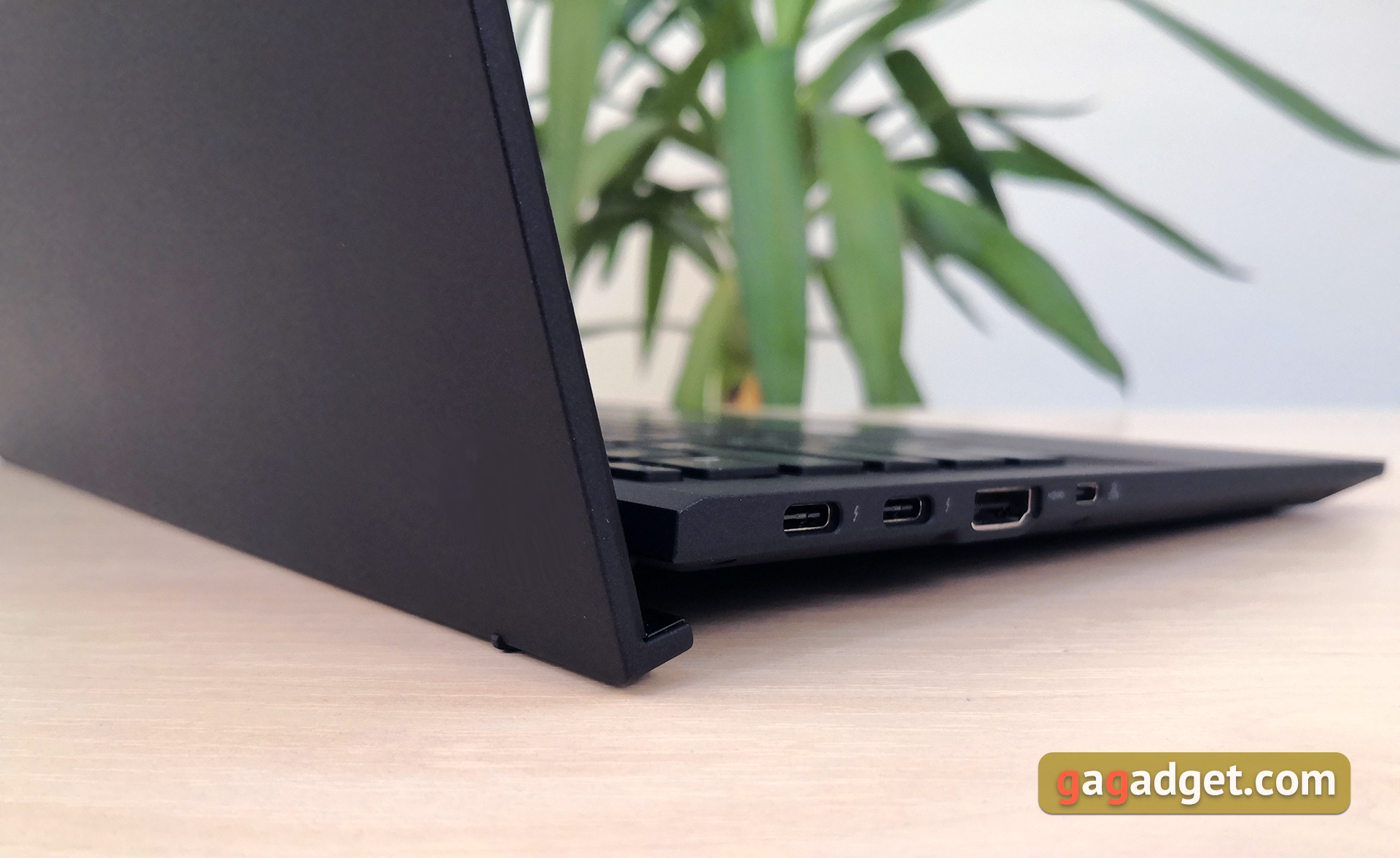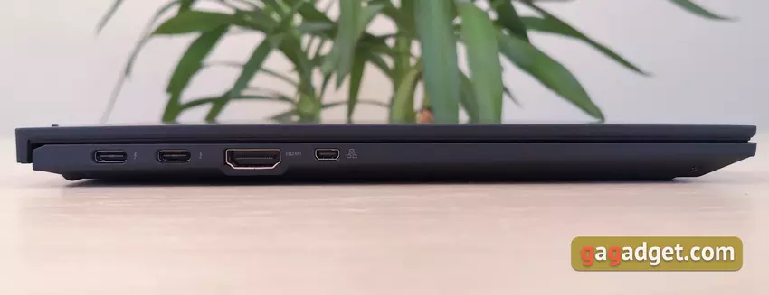 Grubość obudowy wynosi 14,9 mm. W tym samym czasie firmie udało się zainstalować przyzwoitą liczbę złączy w laptopie. Po lewej stronie znajduje się 2xThunderbolt 3 USB-C (do 40 Gb / s, istnieje obsługa DisplayPort i Power Delivery), pełnowymiarowe złącze HDMI i tak zwana sieć LAN RJ-45 za pośrednictwem microHDMI.