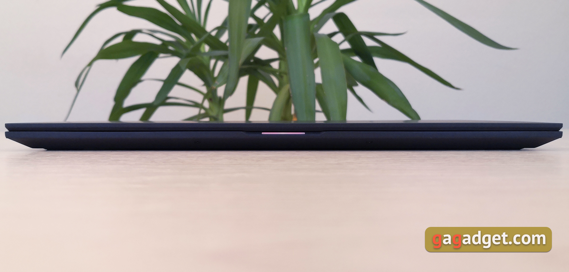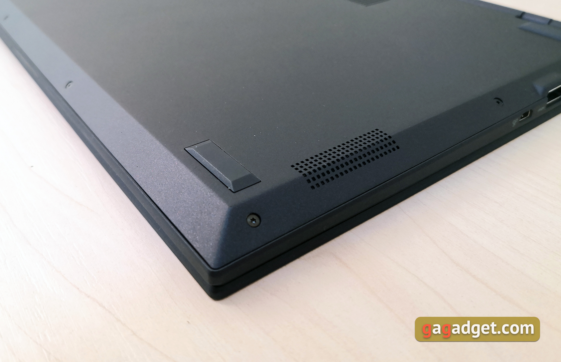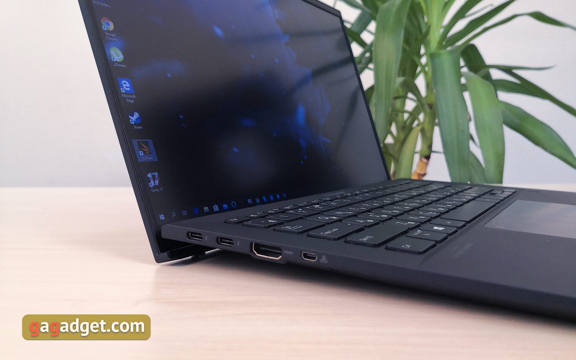 Grubość obudowy wynosi 14,9 mm. W tym samym czasie firmie udało się zainstalować przyzwoitą liczbę złączy w laptopie. Po lewej stronie znajduje się 2xThunderbolt 3 USB-C (do 40 Gb / s, istnieje obsługa DisplayPort i Power Delivery), pełnowymiarowe złącze HDMI i tak zwana sieć LAN RJ-45 za pośrednictwem microHDMI.
