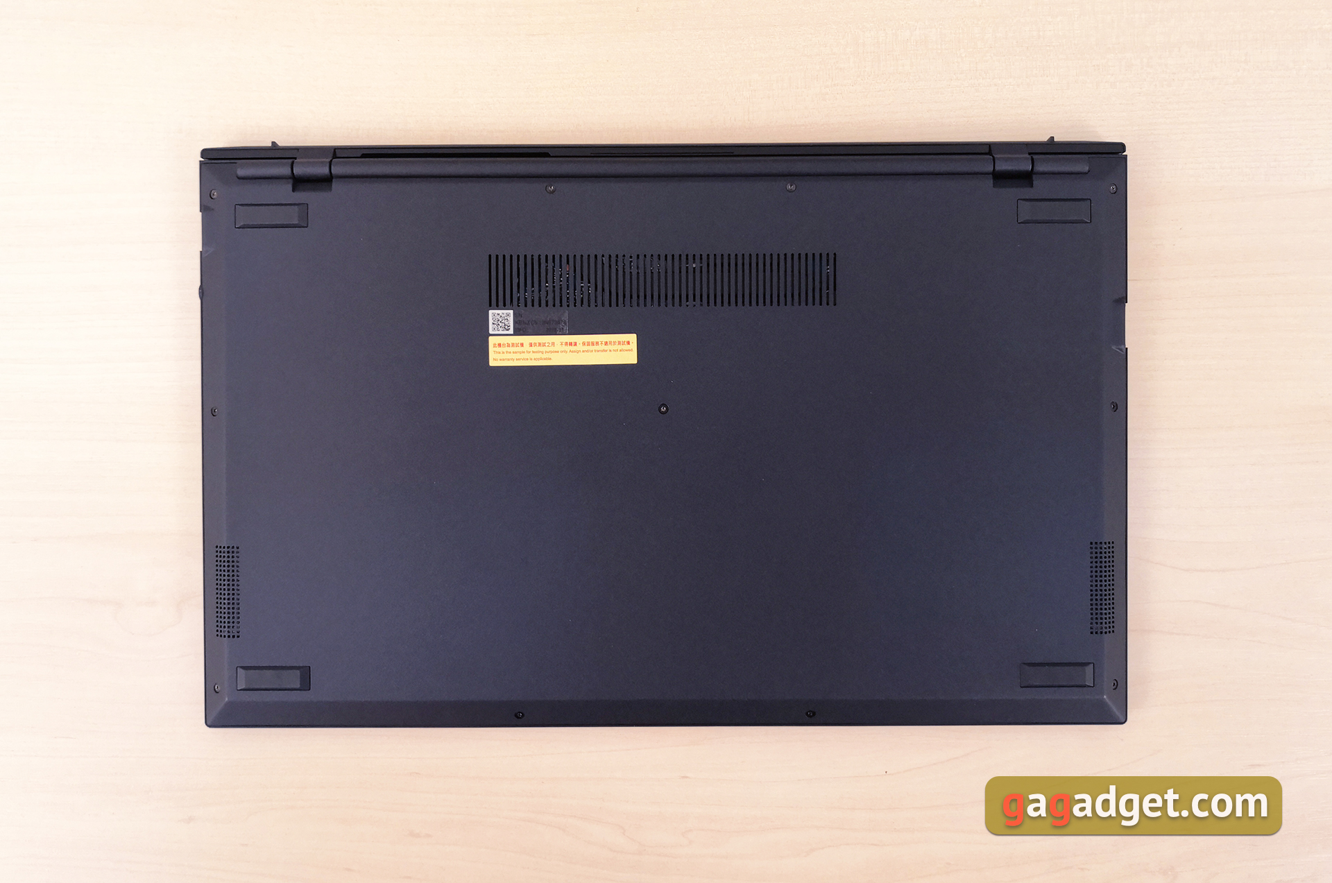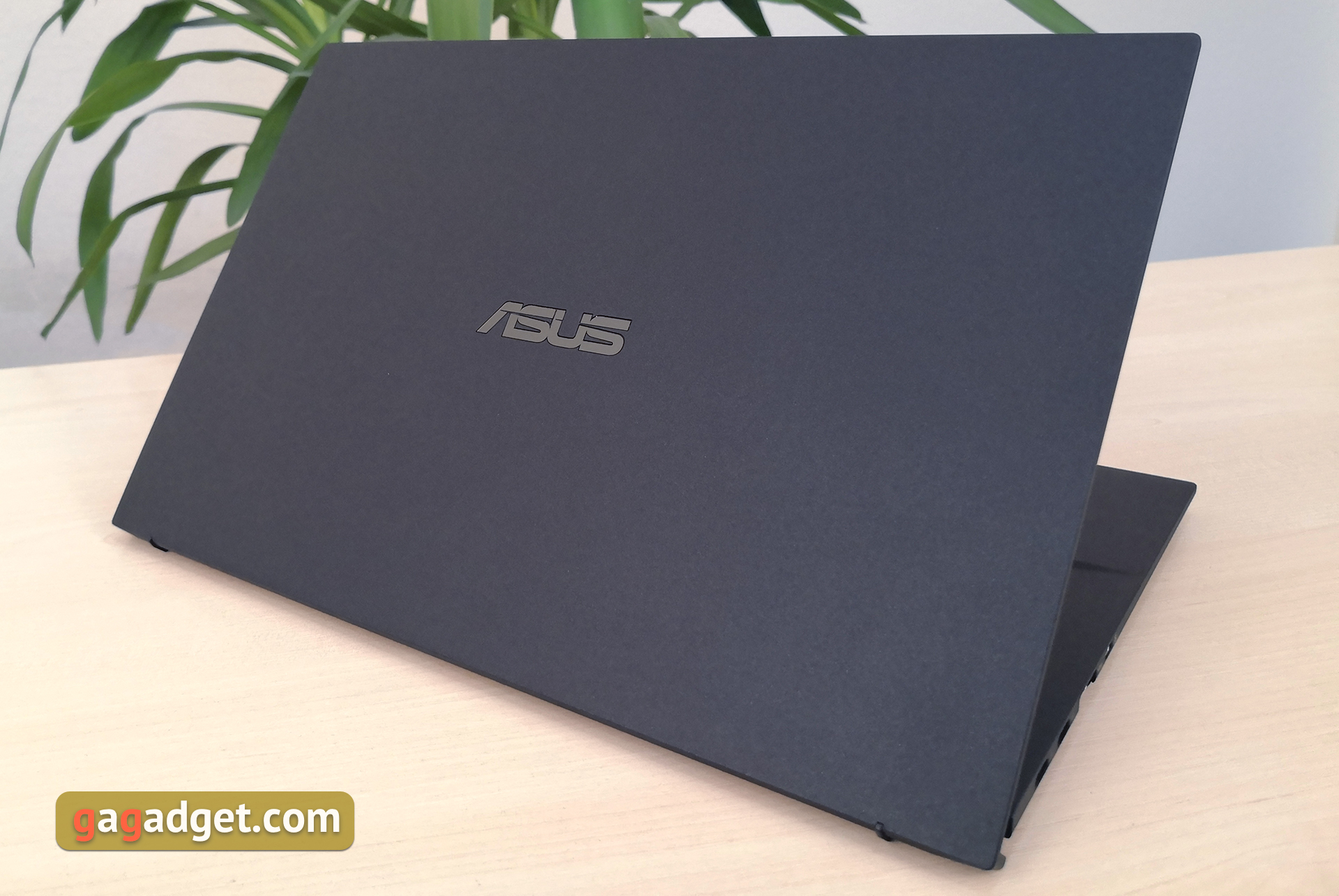 Jesteśmy już przyzwyczajeni do bardzo rozpoznawalnej linii ASUS ZenBook: wygląda fajnie, a wszystkie modele są wykonane z metalu. Dzisiejszy model ASUS ExpertBook B9450FA znacznie się od nich różni: brak koncentrycznych kół na okładce, tylko lustrzane logo. A materiał samej obudowy różni się znacznie od tego, do czego jesteśmy przyzwyczajeni. Jest to stop magnezu z litem, dzięki czemu obudowa była tak lekka. Czuje się jak plastik o bardzo niezwykłej przyjemnej fakturze. Całe ciało jest ciemnoniebieskie z bardzo małymi błyszczącymi plamami. Powłoka jest bardzo praktyczna: nie tylko ładnie wygląda, ale praktycznie nie zbiera wydruków. Pokrowce lekko się wyginają, ale ASUS twierdzi, że mogą wytrzymać 30 kg bez żadnych uszkodzeń. Dotyczy to samych okładek i wyświetlacza z wnętrzami.