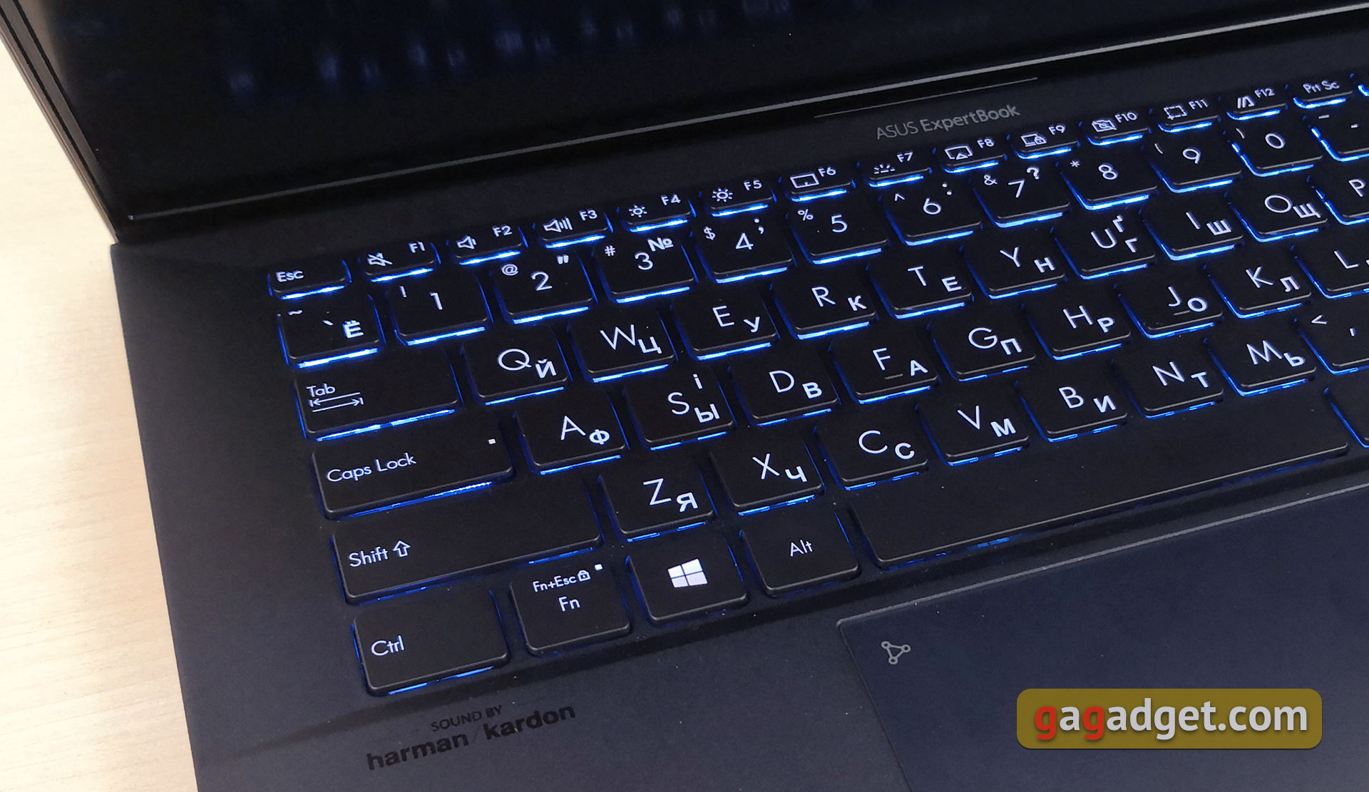Według osobistych odczuć rozmiary guzików i odległości między guzikami są absolutnie standardowe. Ogólnie rzecz biorąc, klawiatura praktycznie uzależnia. Przebieg przycisków (zgodnie z osobistymi odczuciami) stał się bardziej lub po prostu bardziej pouczający niż ZenBook, który mieliśmy. Ma to pozytywny wpływ na odczucia w pracy. Jest białe podświetlenie klawiatury z kilkoma poziomami jasności. ASUS twierdzi, że klawiatura przetrwa kontakt z nawet 66 ml płynu. Postanowiliśmy nie sprawdzać tego momentu, ale jest to zdecydowanie przydatny bonus.