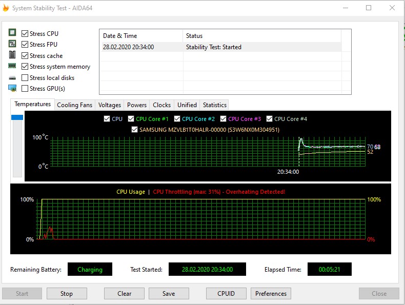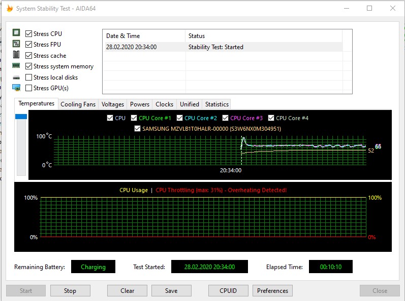 System chłodzenia jest skuteczny: skutecznie radzi sobie ze swoim zadaniem i praktycznie nie hałasuje. W biurze nie słychać go wcale. Test warunków skrajnych wykazał, że przez pierwsze 30 sekund obciążenia szczytowego, podczas gdy system chłodzenia dostosowuje się, dochodzi do przegrzania i dławienia. Ponadto system działa stabilnie, bez dławienia i nie nagrzewa się powyżej 70 °. Obudowa praktycznie się nie nagrzewa, wszystkie „robocze” powierzchnie, które dotykasz podczas pracy, pozostają zimne.