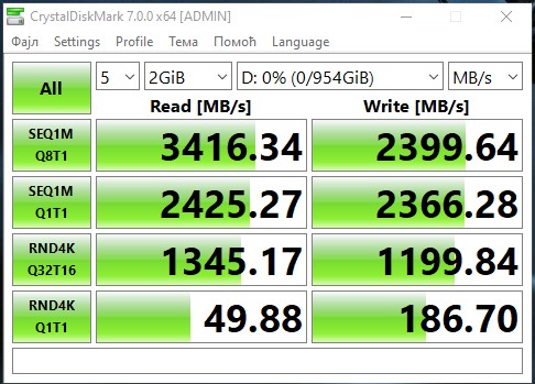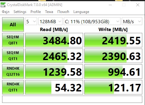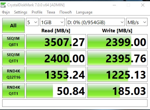 Wykazują bardzo wysoką prędkość, której należy się spodziewać. Około 3500 MB / s podczas czytania i 2450 MB / s podczas pisania: