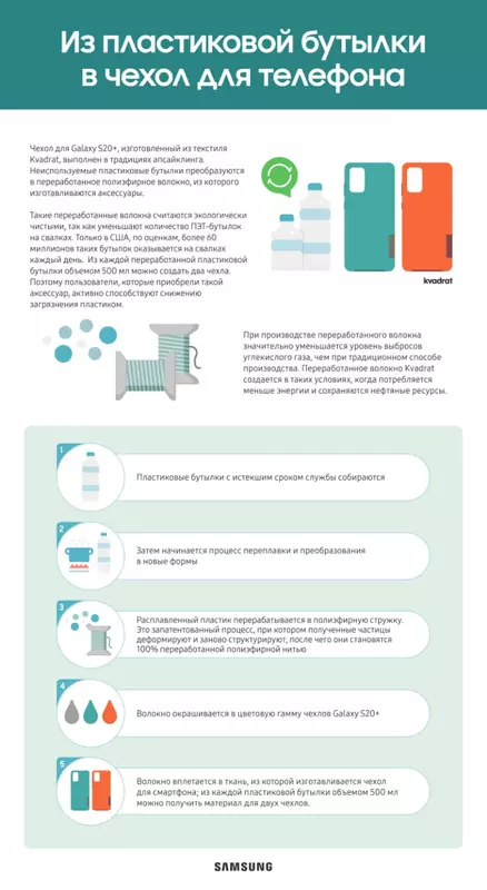 „Takie materiały z recyklingu pomagają rozwiązać problem recyklingu tworzyw sztucznych. Tworzenie włókien z plastikowych butelek jest procesem przyjaznym dla środowiska, który odbywa się bez udziału ciężkich maszyn, przyczyniając się w ten sposób do zachowania nieodnawialnych źródeł energii ”- powiedział Samsung.
