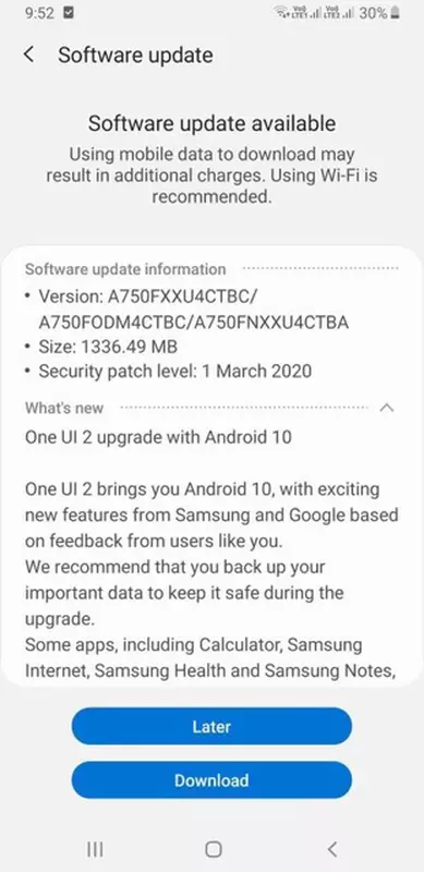 System zawiera marcową poprawkę bezpieczeństwa, wszystkie główne zmiany w Androidzie 10, a także nową zastrzeżoną powłokę One UI 2.0 z zaktualizowanym interfejsem, ciemnym motywem itp.