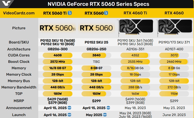 Jak przewidywano, RTX 5060 Ti trafi do sprzedaży w dwóch wersjach: z 8 GB i 16 GB pamięci, zaś młodszy model oferowany jest tylko z 8 GB.