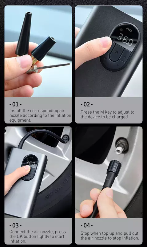 Urządzenie automatycznie wykrywa ciśnienie w oponach. Po osiągnięciu żądanego poziomu ciśnienia urządzenie automatycznie przerwie pracę. Niezbędne informacje o ciśnieniu są wyświetlane na wyświetlaczu, pod nim znajdują się przyciski do sterowania.