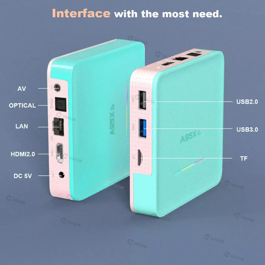 VONTAR A95X R5 pracuje pod kerowaniem systemu operacyjne Android 10.0 opartym na 4- rdzeniowym procesorze Rockchip RK3318 (ARM Cortex-A53 @ 1,5 GHz) z GPU Mali-450mp5. Producent obiecuje rozdzielczość wideo do 4K @ 60 Fps, wsparcie HDR 10, Bluetooth 4.0 i dwuzakresowe WiFi.