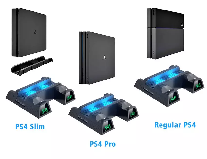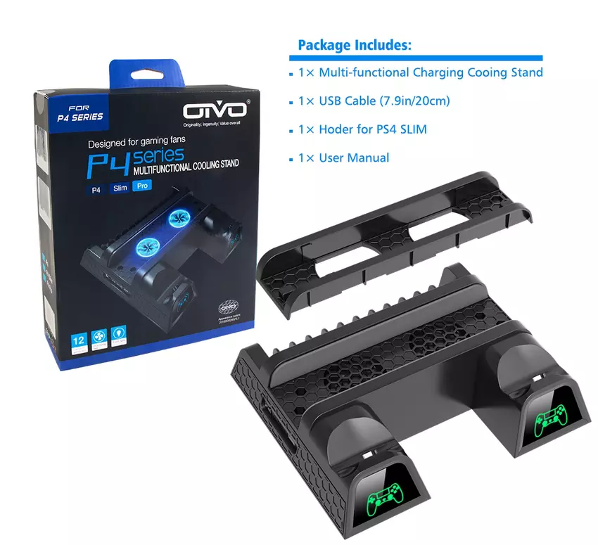 Po drugie, wewnątrz urządzenia znajdują się dwie chłodnice do chłodzenia. Aby to zrobić, wystarczy zainstalować Playstation, jak na stojaku. Nawiasem mówiąc, konsola będzie również działać jako podstawka. Obiecują cichą pracę, podświetlenie i wsparcie dla PS4/PS4 SLIM/PS4 PRO.