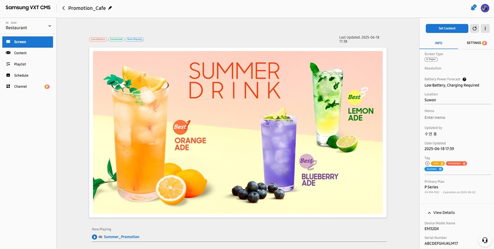 Jedną z najwygodniejszych funkcji Samsung Color E-Paper jest pełna zdalna praca przez platformę Samsung VXT. Trzeba zmienić menu, zaktualizować ofertę promocyjną czy powiesić zimowy wystrój zamiast letniego? Nie trzeba podchodzić do wyświetlacza ani biegać z flashdiskami.