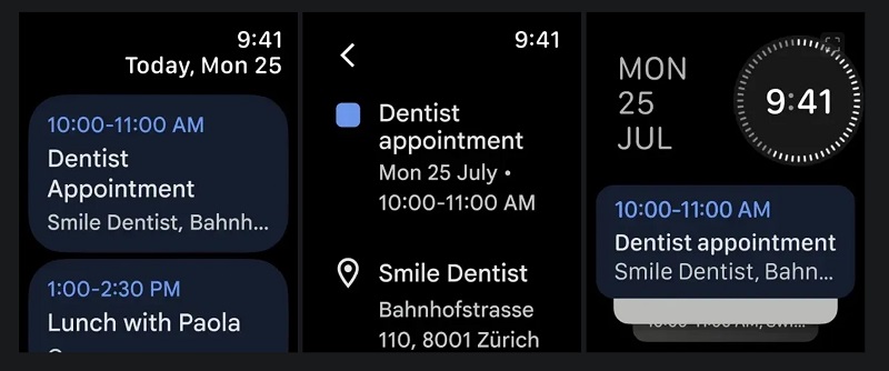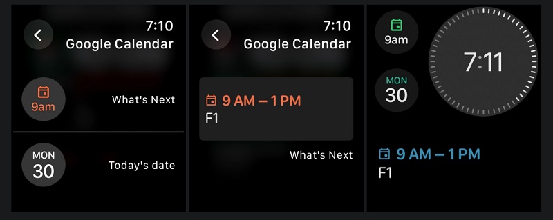 „Kalendarz” stał się czwartą aplikacją od Google dla watchOS i oferuje wygodny interfejs: wydarzenia są wyświetlane w postaci kart z kolorowym oznaczeniem, wskazaniem czasu, nazwy i lokalizacji spotkania. Dostępny jest również tygodniowy przegląd oraz lista bieżących dat w prawym górnym rogu ekranu.