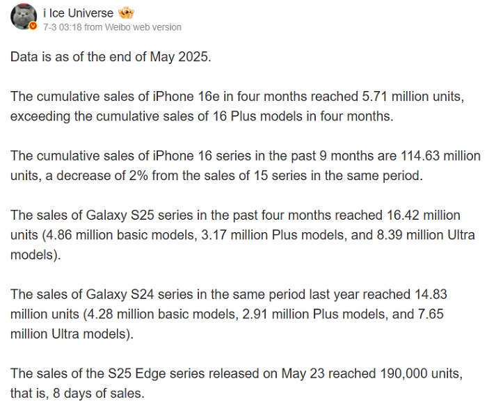 Ice Universe poinformował, że ultracienki Galaxy S25 Edge nie powiódł się w sprzedaży — w ciągu pierwszych 8 dni sprzedano zaledwie 190 tys. smartfonów, podczas gdy Samsung planował sprzedaż co najmniej 500 tys. urządzeń.
