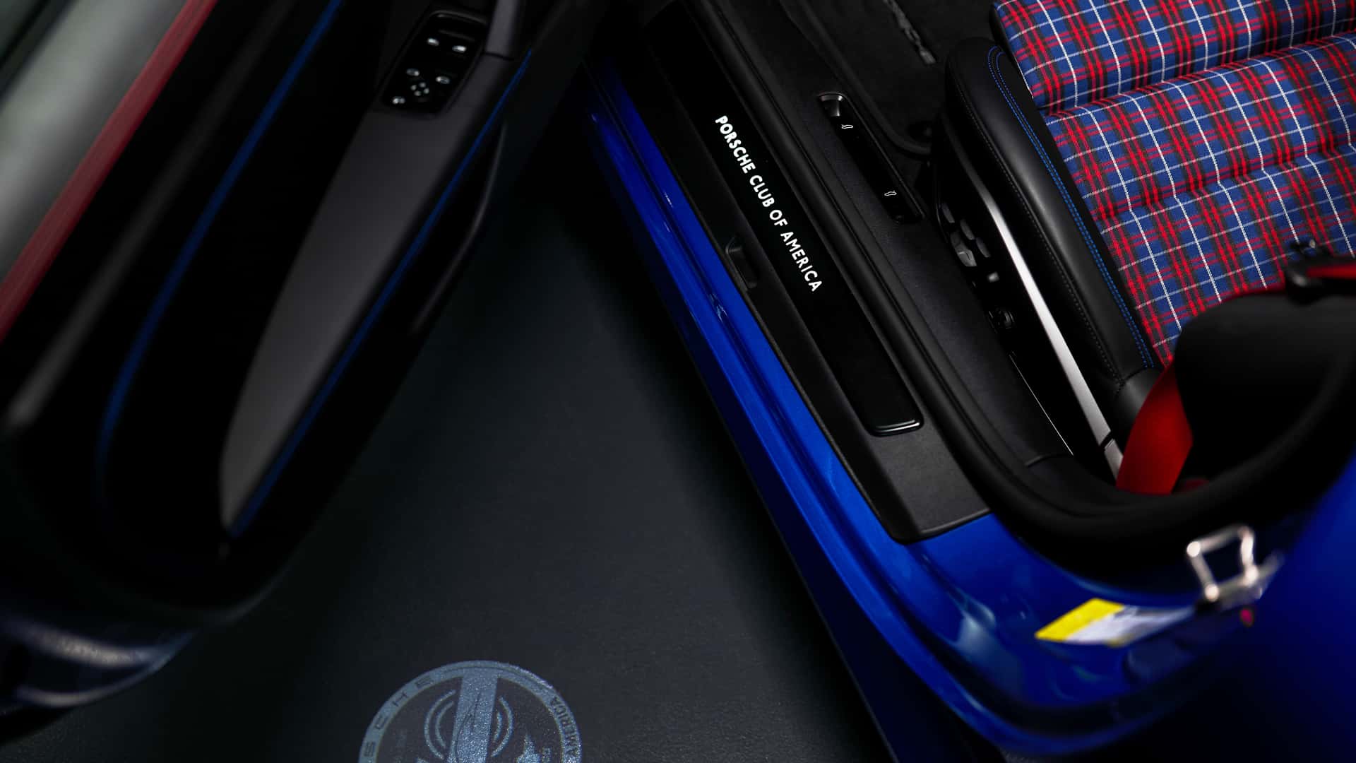 Koła — 20 cali z przodu i 21 z tyłu — pomalowane są na matową czerń z srebrnymi wstawkami. Wnętrze — czarna skóra ze szwami w kolorach Speed Blue i Guards Red, tabliczki PCA na progach, centralnej konsoli i logo projekcyjnym w drzwiach.