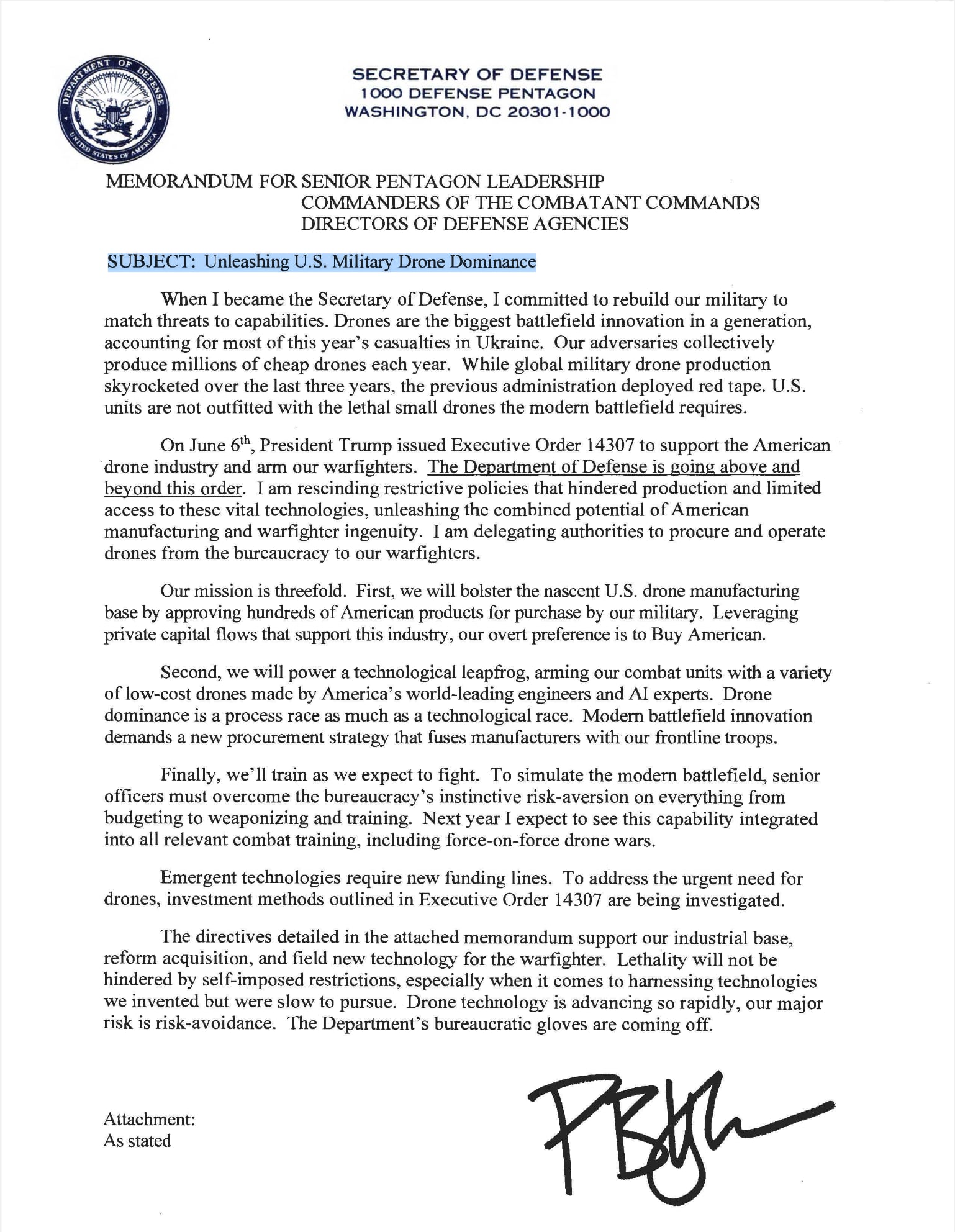 Na tle wojny w Ukrainie i na Bliskim Wschodzie bezzałogowce już udowodniły swoją skuteczność. Od „Shahedów”, które masowo atakują ukraińską infrastrukturę, po izraelską operację przeciwko Iranowi — drony coraz bardziej zastępują tradycyjne załogowe samoloty. Aby wspierać przemysł, Pentagon planuje wydanie zaliczek na zakupy oraz udzielenie bezpośrednich kredytów producentom. Główny nacisk kładzie się na firmy z USA. Hegseth wyraźnie stwierdził, że USA powinny osiągnąć dominację w tej dziedzinie do końca 2027 roku: „W przyszłym roku chcę widzieć drony we wszystkich ćwiczeniach armii, w tym symulacjach wojny rojów”.