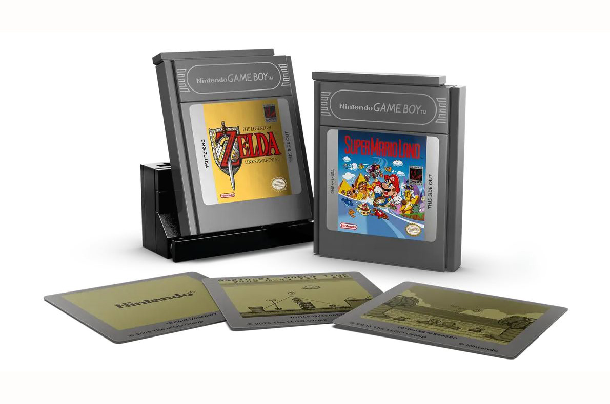 - Dwa kartridże w formie bloków LEGO — Super Mario Land i The Legend of Zelda: Link’s Awakening