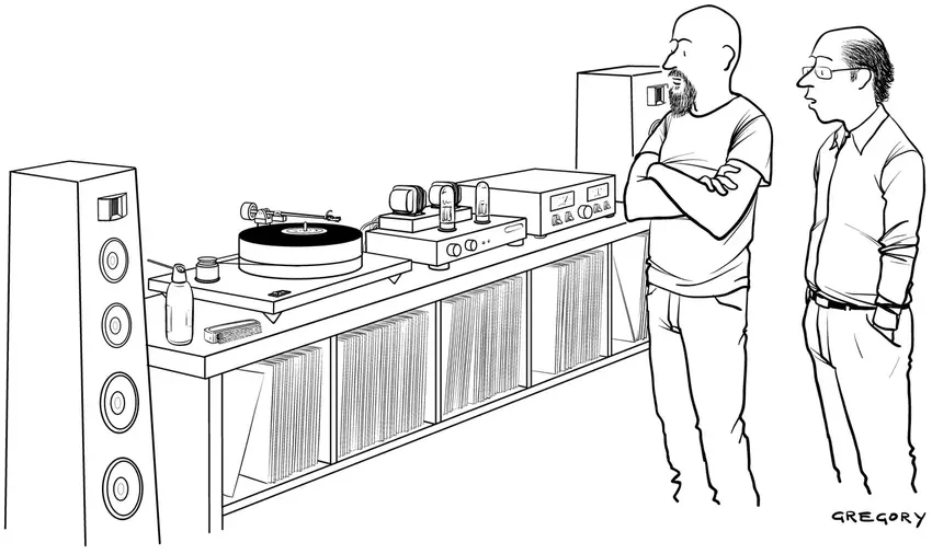 W winylach najbardziej przyciągają mnie dwie rzeczy — kosztowność i niewygoda. Źródło: https://www.newyorker.com/cartoon/a19180