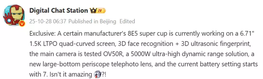 Smartfon ma wyraźnie konkurować z nadchodzącymi "ultra" flagowcami Xiaomi 17 Ultra, Oppo Find X9 Ultra i Vivo X300 Ultra. Według osoby wtajemniczonej w Digital Chat Station, urządzenie otrzyma najwyższej klasy układ Snapdragon 8 Elite Gen 5, duży czujnik peryskopowy 200 MP i baterię o pojemności około 7000 mAh.