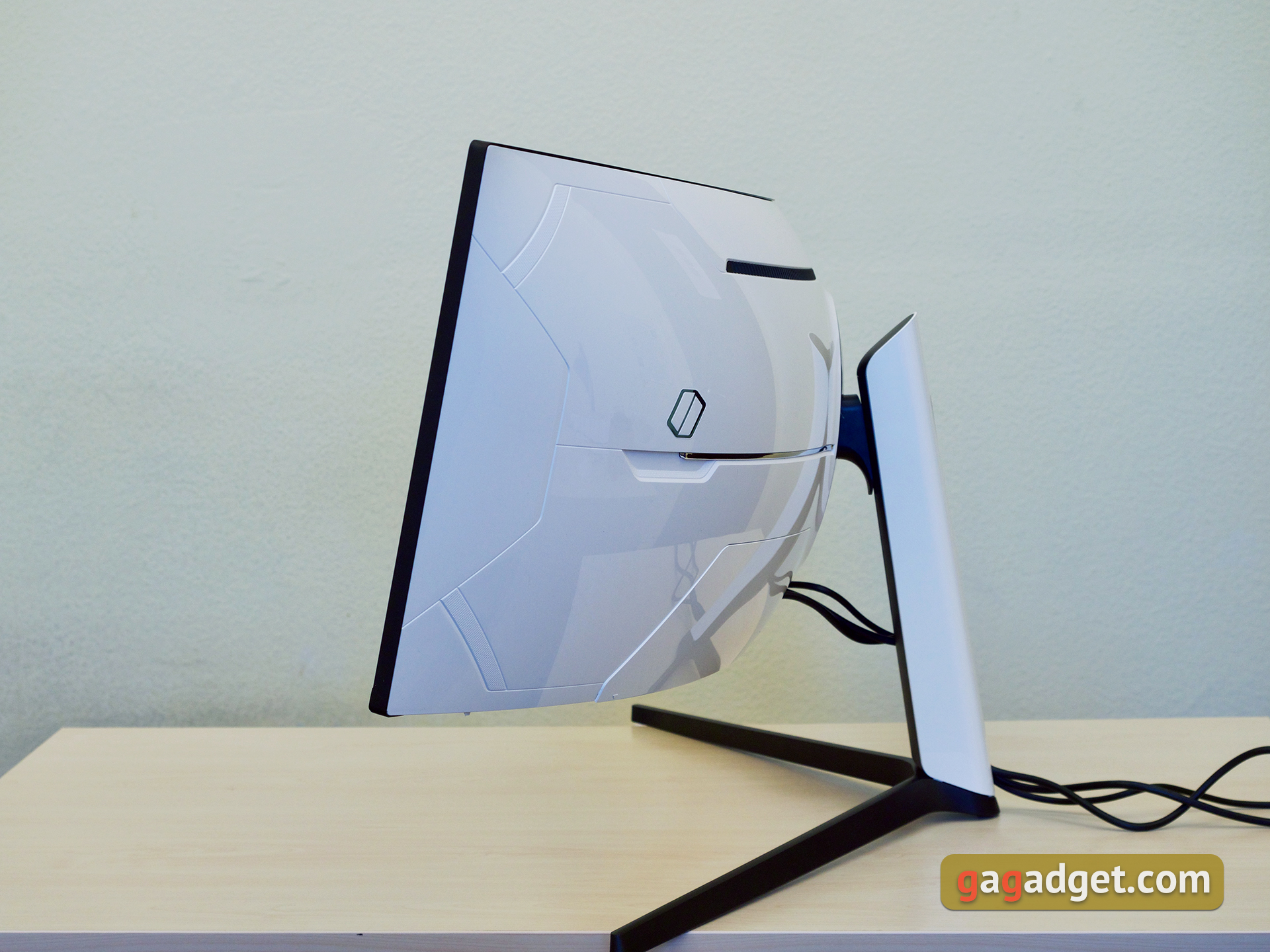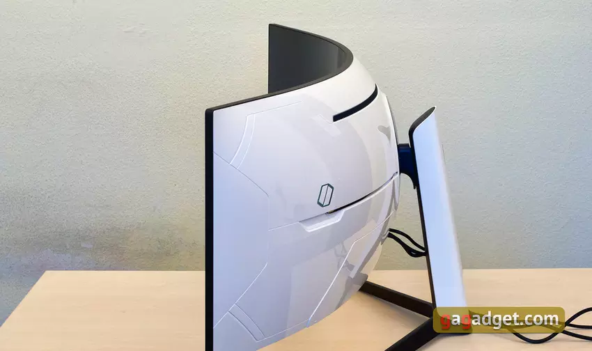 Samsung Odyssey G9 wygląda kosmicznie. I dotyczy to nie tylko „wydłużonych” proporcji ekranu 32:9, ogromnych wymiarów i futurystycznej tylnej ścianki z podświetleniem. Kolejną ważną cechą jest zakręt. Tak, to nie jest pierwszy zakrzywiony monitor, któremu robiliśmy recenzję. Ale zwykle promień krzywizny w większości nowoczesnych modeli wynosi 1800R lub mówiąc prościej – 1800 mm. W Samsung Odyssey G9 on wynosi 1000R. Dlatego można wywnioskować, że zakręt jest bardziej widoczny. Według firmy Samsung jest to pierwszy na świecie zakrzywiony monitor 1000R. Jak podaje firma, ta krzywizna pasuje do kształtu ludzkiego oka, co powinno pozytywnie wpłynąć na pracę z monitorem.