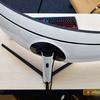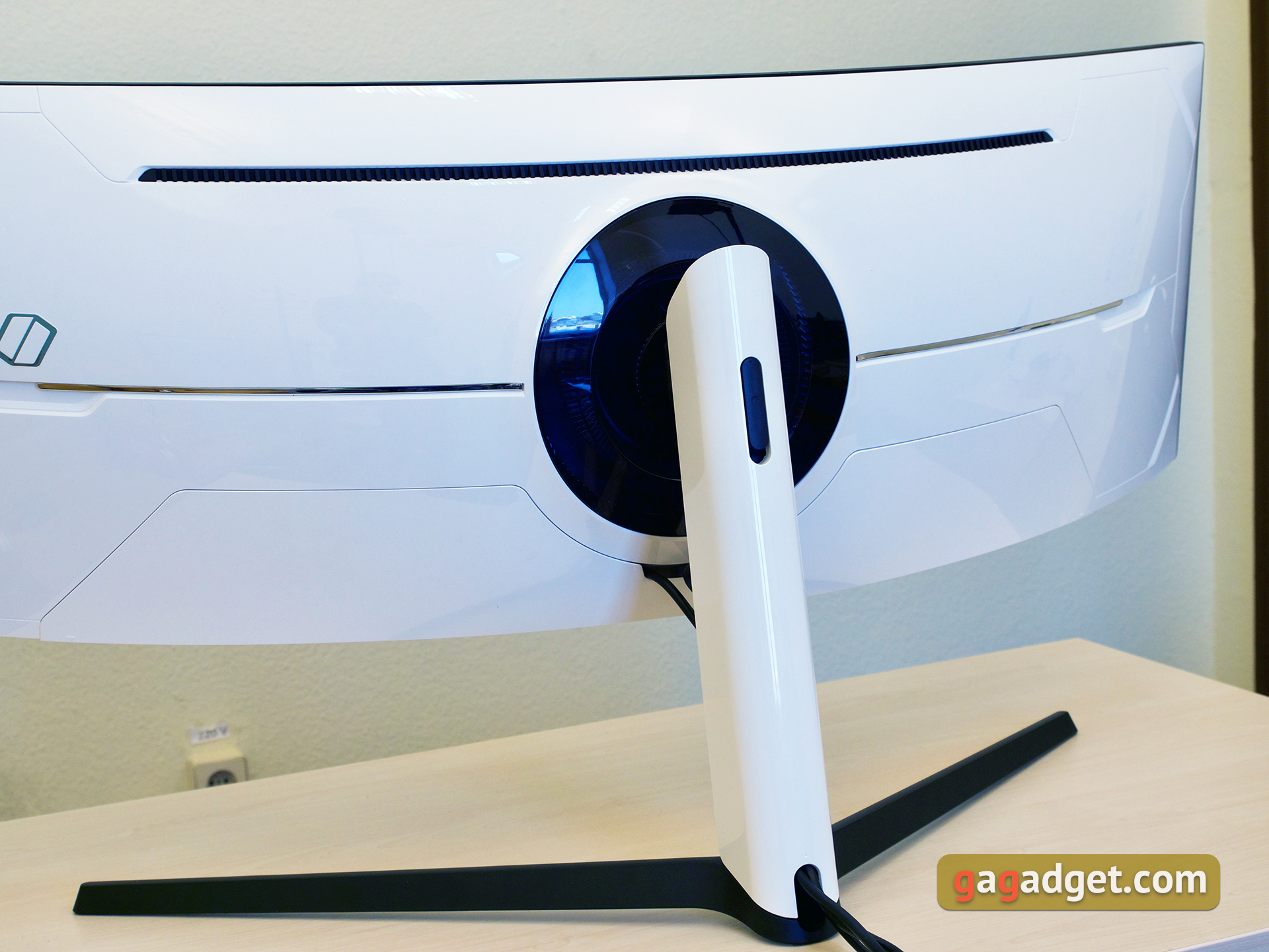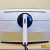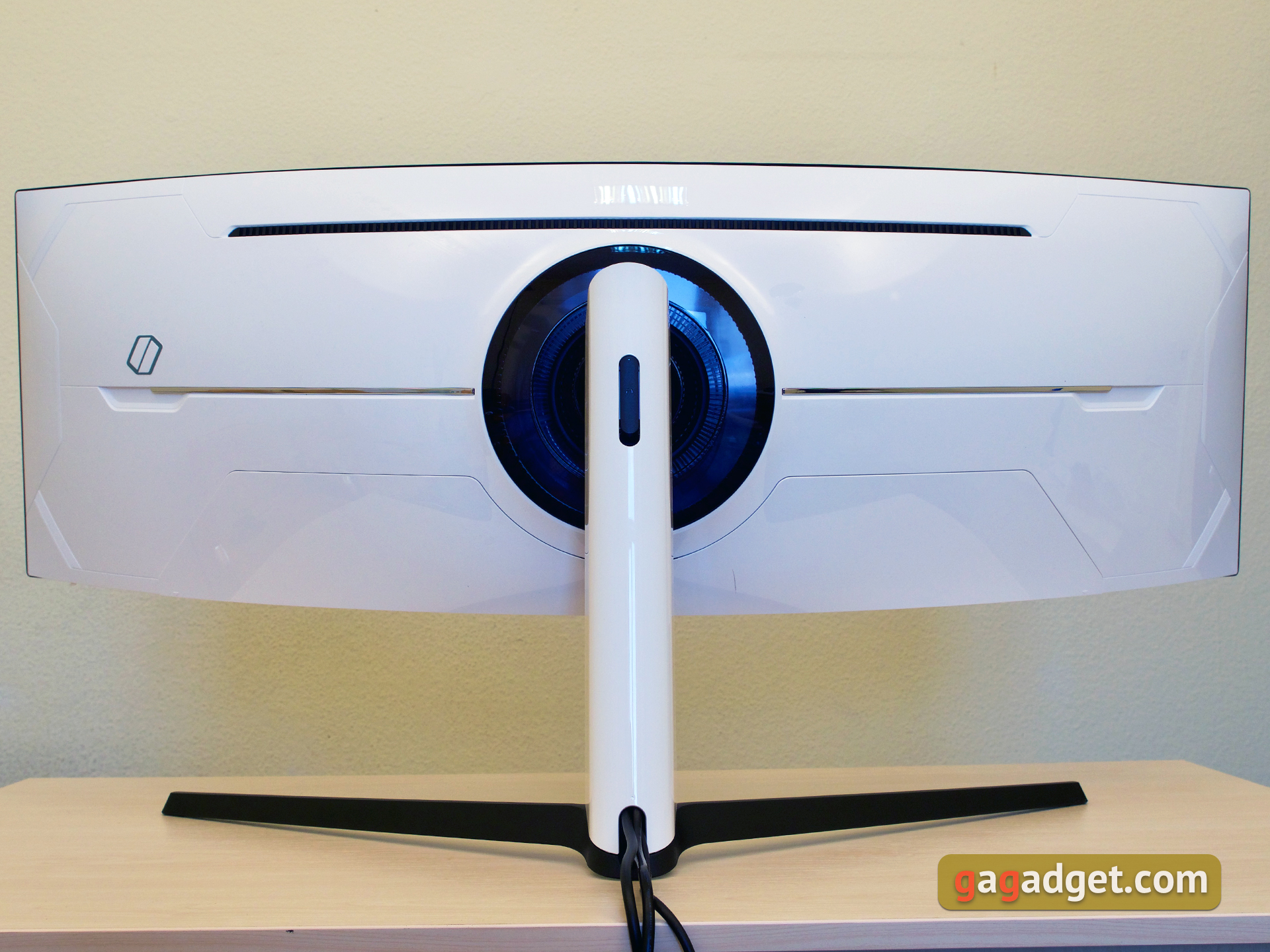 Tylny panel Samsung Odyssey G9 jest prawie w całości wykonany z błyszczącego białego plastiku. Pośrodku znajduje się ozdobny srebrny pasek, po lewej logo linii gamingowej Samsung Odyssey. Oświetlenie Infinity Core RGB otacza miejsce, w którym podstawa jest przymocowana do monitora. A samą ladę można odłączyć, zamiast niej da się zamontować kompletną część z otworami VESA do umiejscowienia monitora na ścianie. Dolna część obudowy wraz ze wszystkimi złączami zamykana jest zdejmowaną pokrywą.