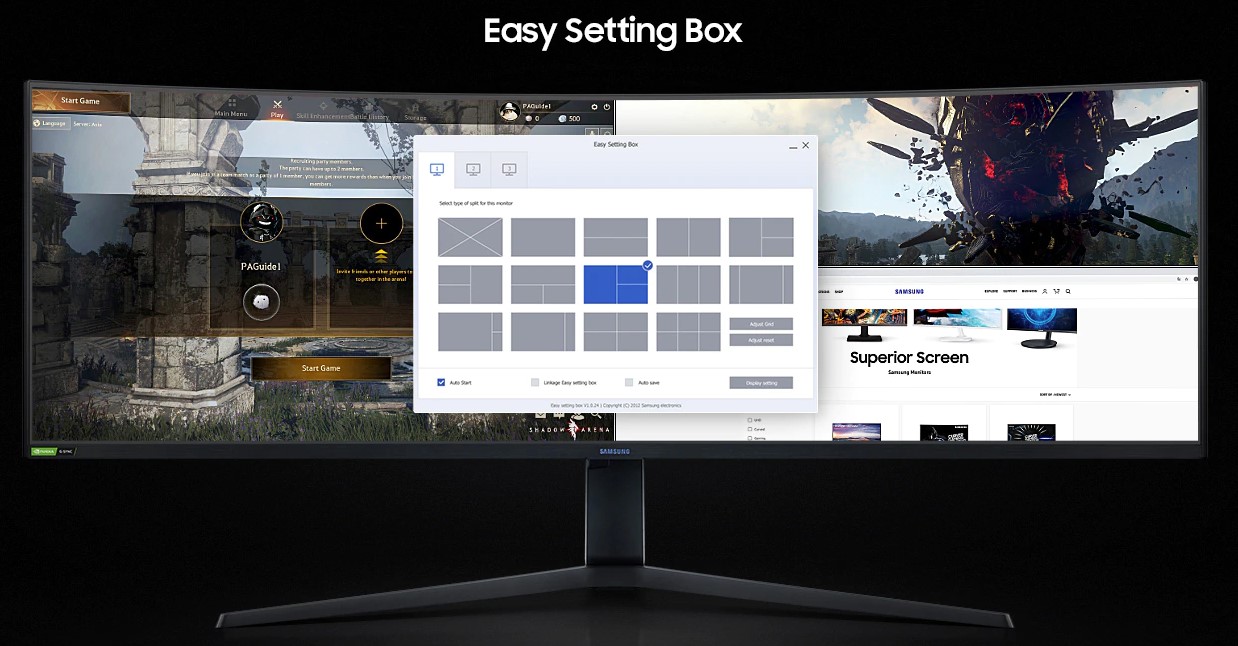 W przeciwnym razie podczas korzystania z monitora nie będzie więcej „niespodzianek”. Jeśli mówimy o pracy na Samsungu Odyssey G9 i ogólnie zaletach tego formatu, to warto wziąć pod uwagę, że są to właściwie 2 monitory 27 cali o proporcjach 16: 9 i rozdzielczości 2560x1440, które były sklejone w jedną całość. Jeśli więc użytkownik jest przyzwyczajony do dwóch monitorów, to nie będzie pytań: tabele po jednej stronie i przeglądarka po drugiej, rozciągnięta oś czasu w edytorach wideo / audio, dwa źródła sygnału jednocześnie – to wszystko jest naprawdę wygodne. Ale trzeba się do tego przyzwyczaić. Aby zapewnić szybką i wygodną organizację przestrzeni, dostarczono opatentowane narzędzie Easy Setting Box.