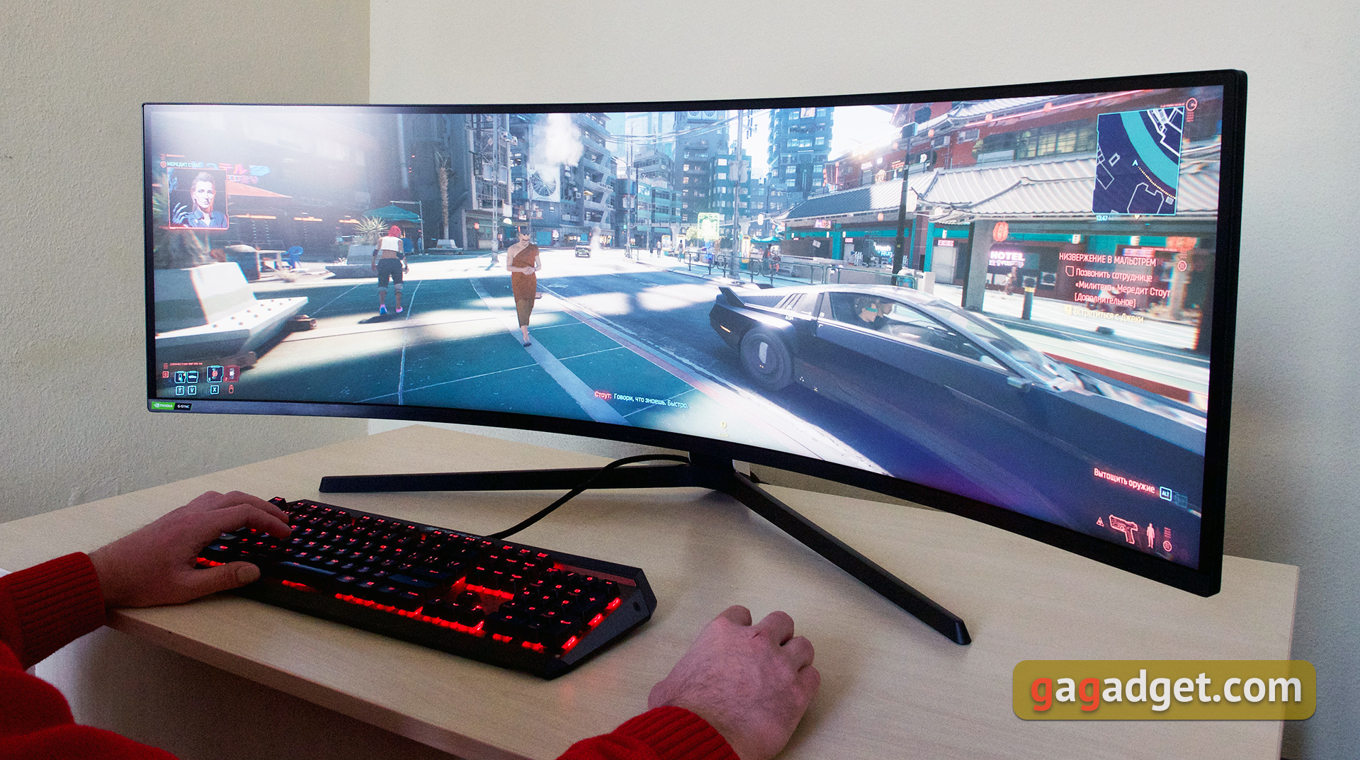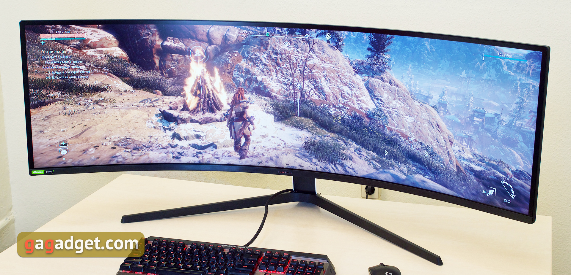 Samsung Odyssey G9 to przede wszystkim monitor gamingowy. I patrząc pod kątem “ciężkich” gier, wszystkie parametry są jak najbardziej dobre: istnieje wsparcie dla synchronizacji liczby klatek na sekundę AMD FreeSync Premium Pro i NVIDIA G-Sync, co w połączeniu z wysokiej jakości i jasną matrycą, częstotliwość klatek do 240 Hz i deklarowany czas reakcji 1 ms, teoretycznie pozwoli uzyskać bardzo wysokiej jakości obraz bez błędów, przerw w klatkach i rozmazania obrazu.