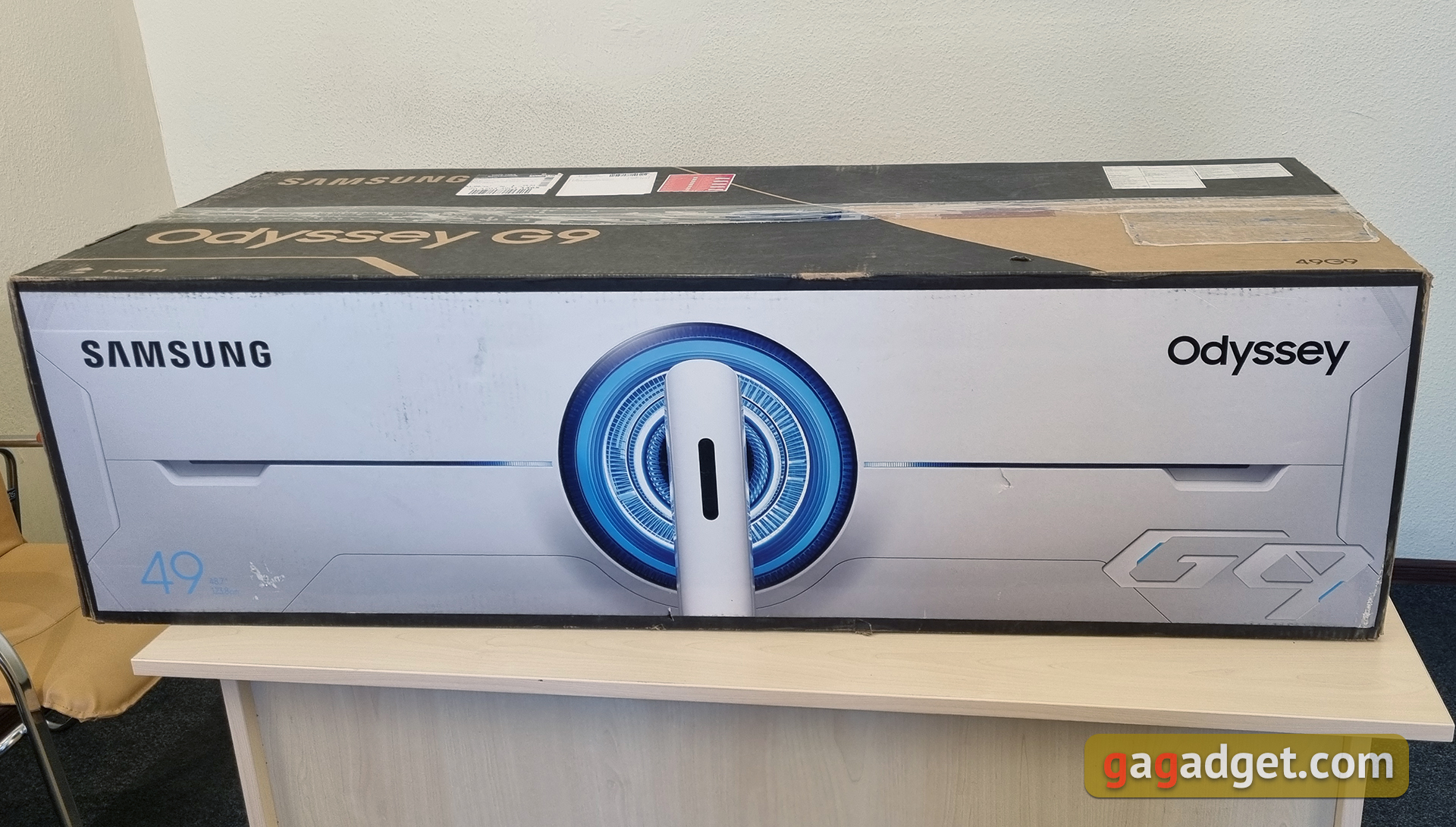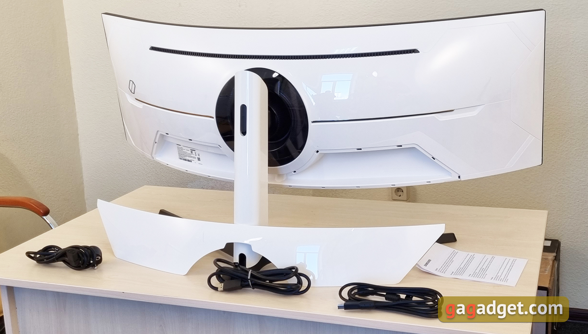 Dla dużego monitora, potrzebne jest duże pudełko. Rzeczywiście, opakowanie Samsung Odyssey G9 jest bardzo ciężkie, a przenoszenie z miejsca na miejsce urządzenia może być trudne. Wewnątrz mamy – sam monitor, ladę, podstawkę, zdejmowaną osłonę na tylny panel, część zamienna do montażu monitora na ścianie, kable zasilające, DisplayPort 1.4, USB (do koncentratora) i towarzysząca dokumentacja.