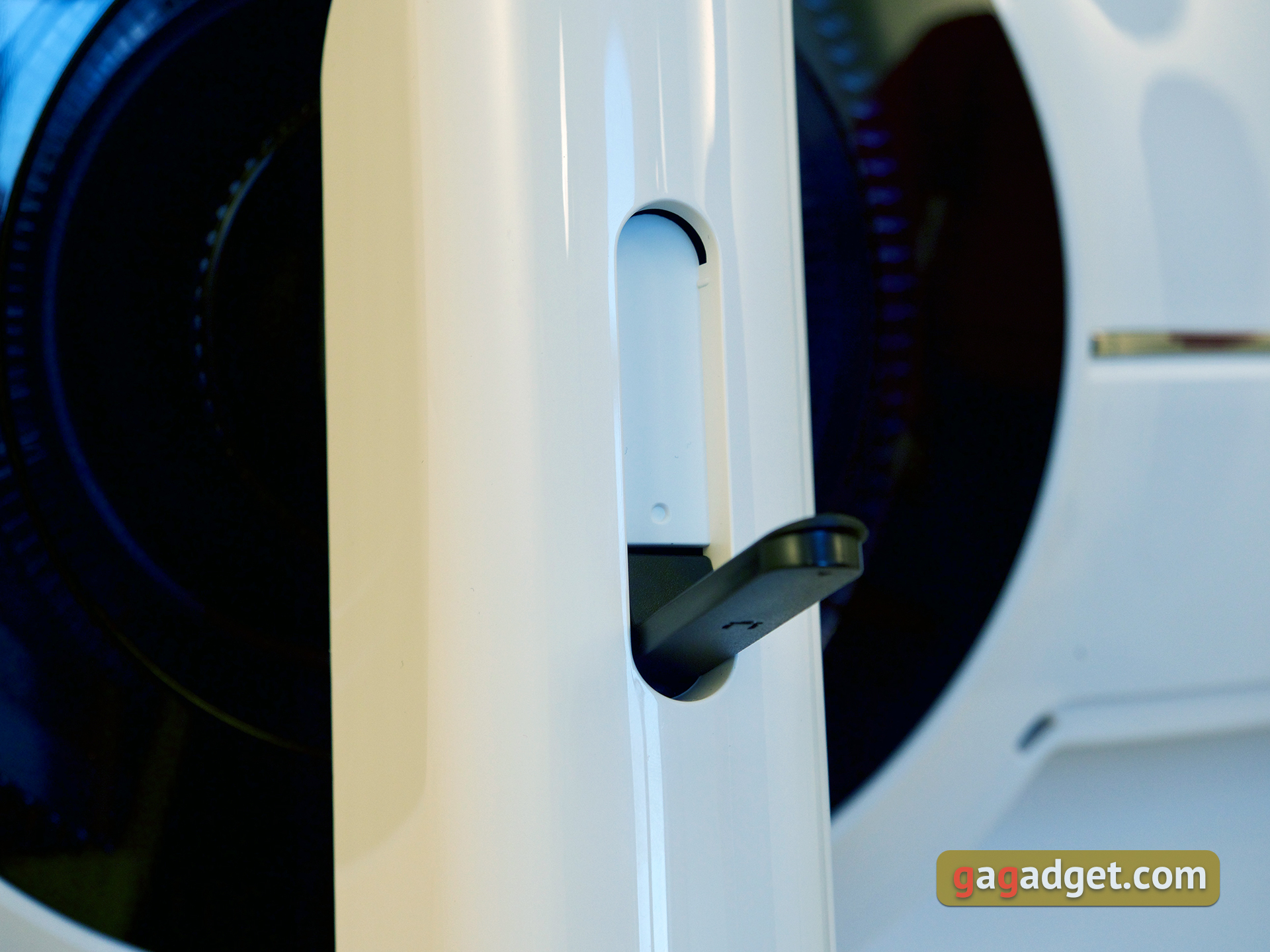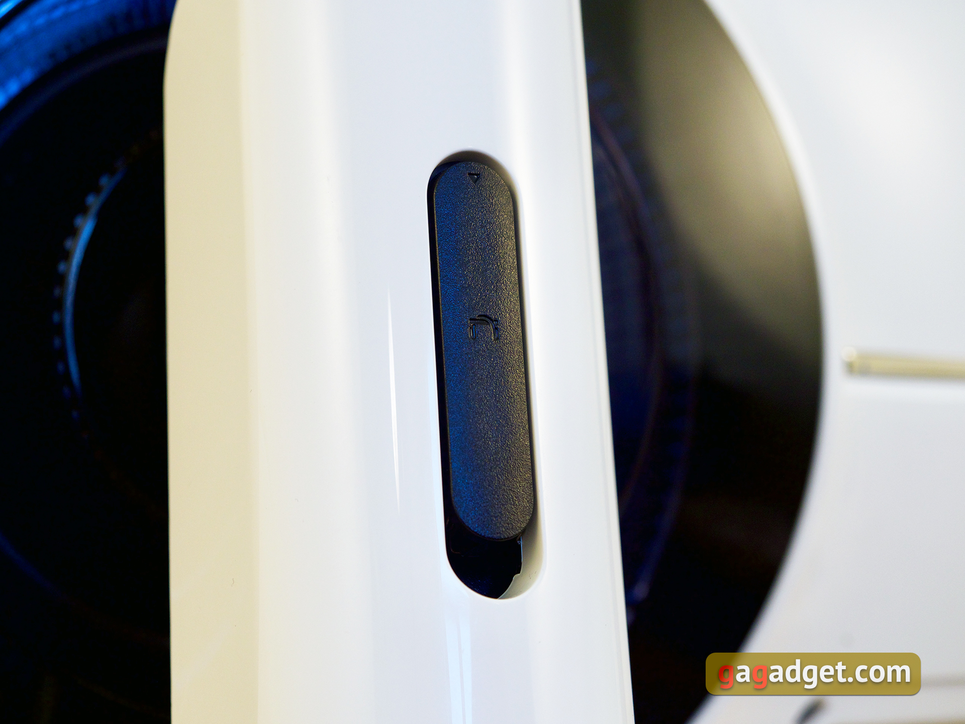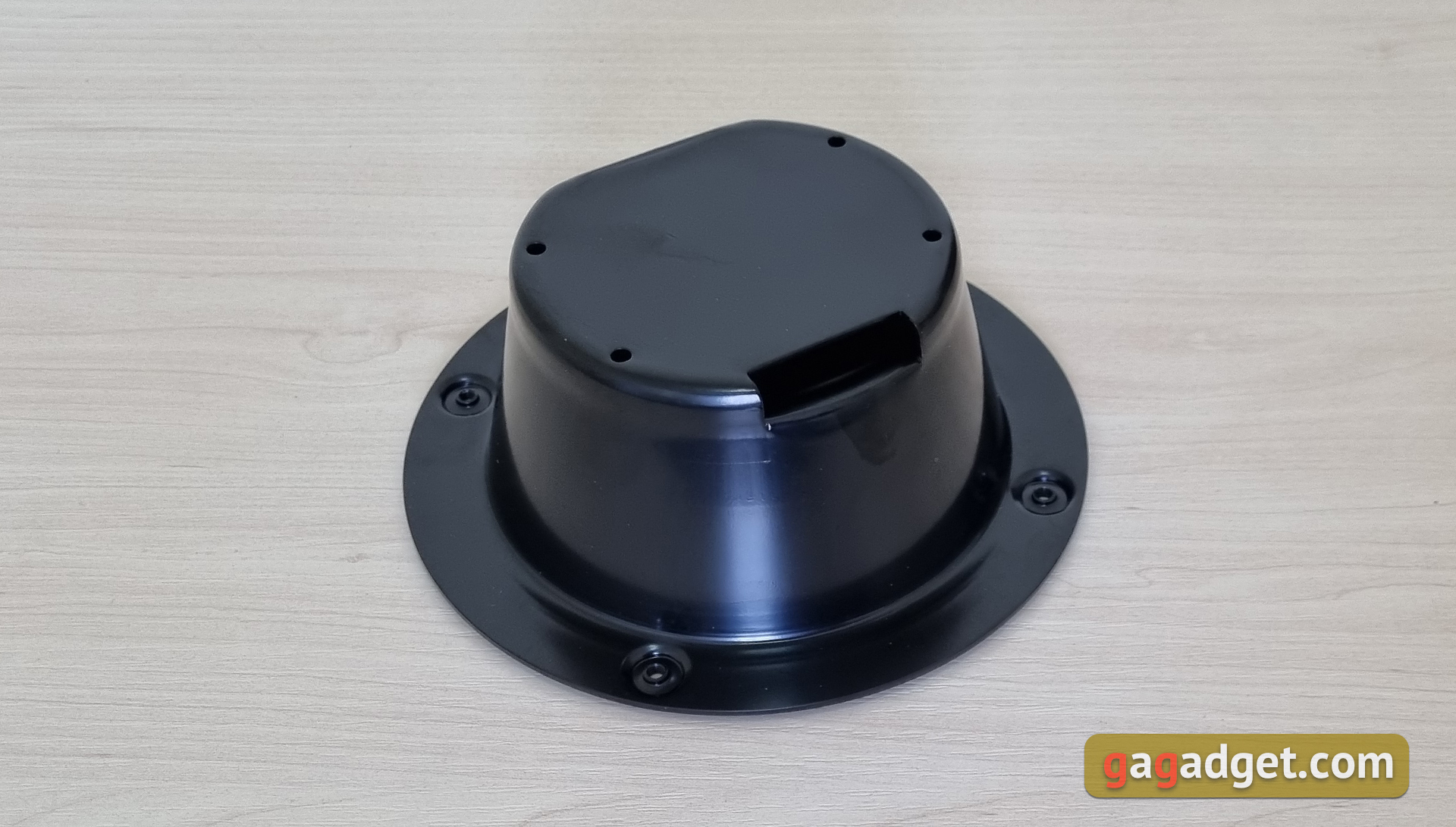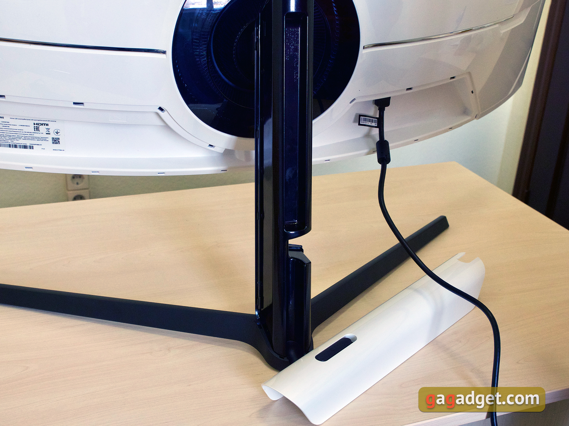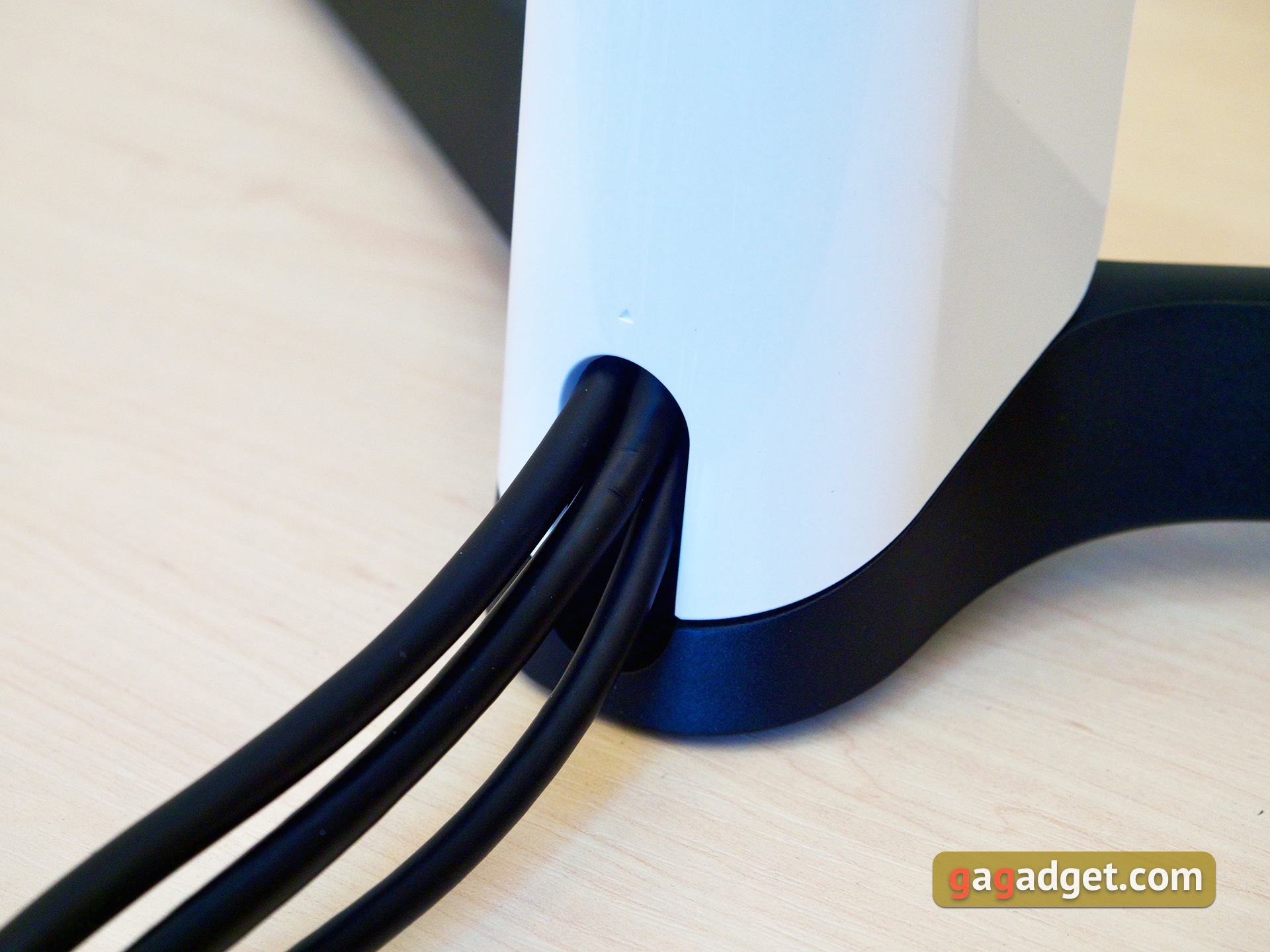 Podstawka jest zamknięta białą błyszczącą plastikową pokrywą. Istnieje możliwość ułożenia kabli, o czym powiemy trochę później.