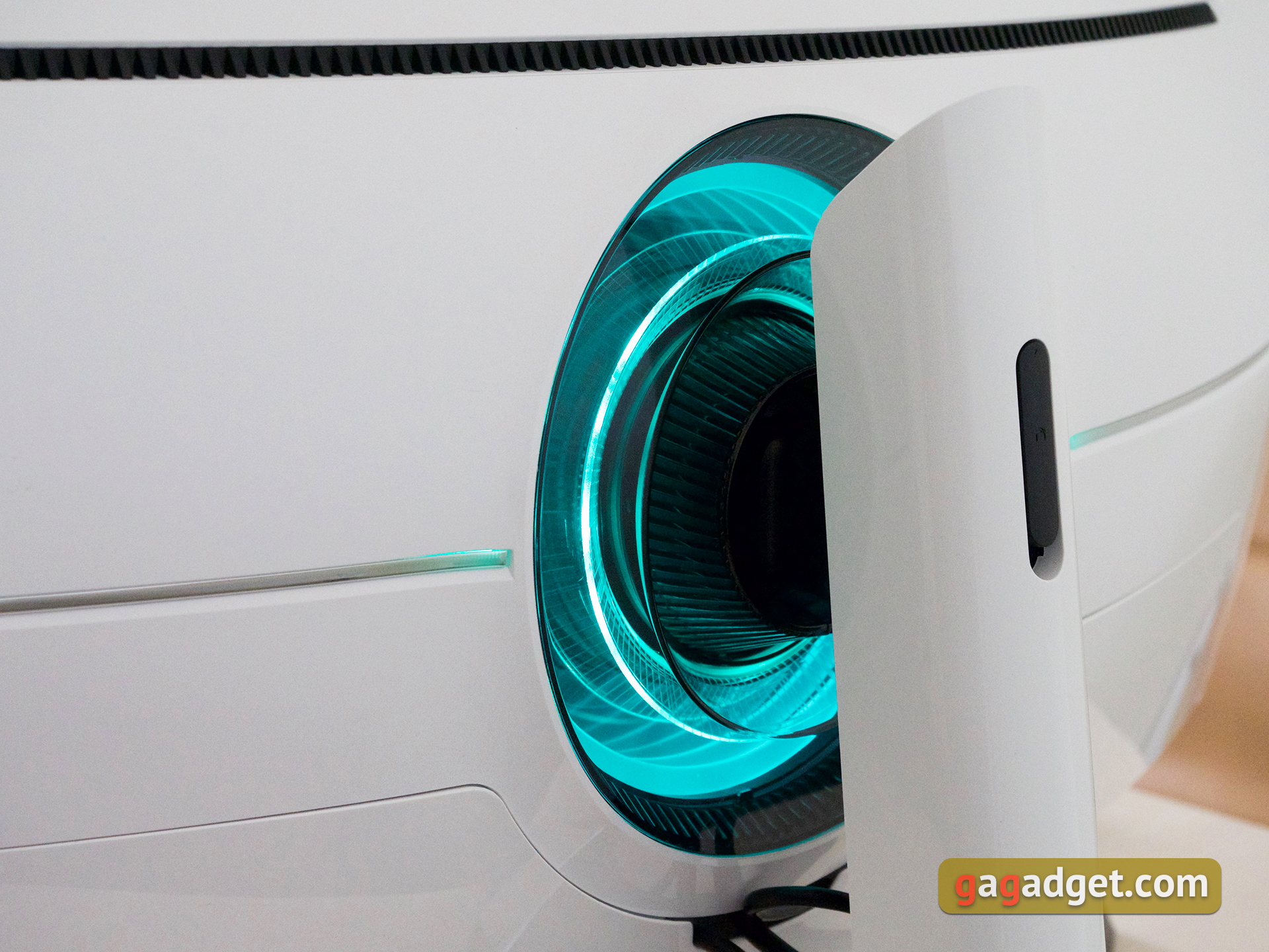 Czym jest flagowy monitor do gier bez oświetlenia RGB? Infinity Core Lightning wygląda bardzo futurystycznie, przypominając turbinę silnika odrzutowego. Możesz ją konfigurować na różne sposoby: wybierać kolor, różne efekty lub po prostu wyłączyć. Szczególnie ciekawie będzie wyglądać podświetlenie wieczorem, przy zgaszonym światle, jeśli monitor zostanie zamontowany blisko ściany.