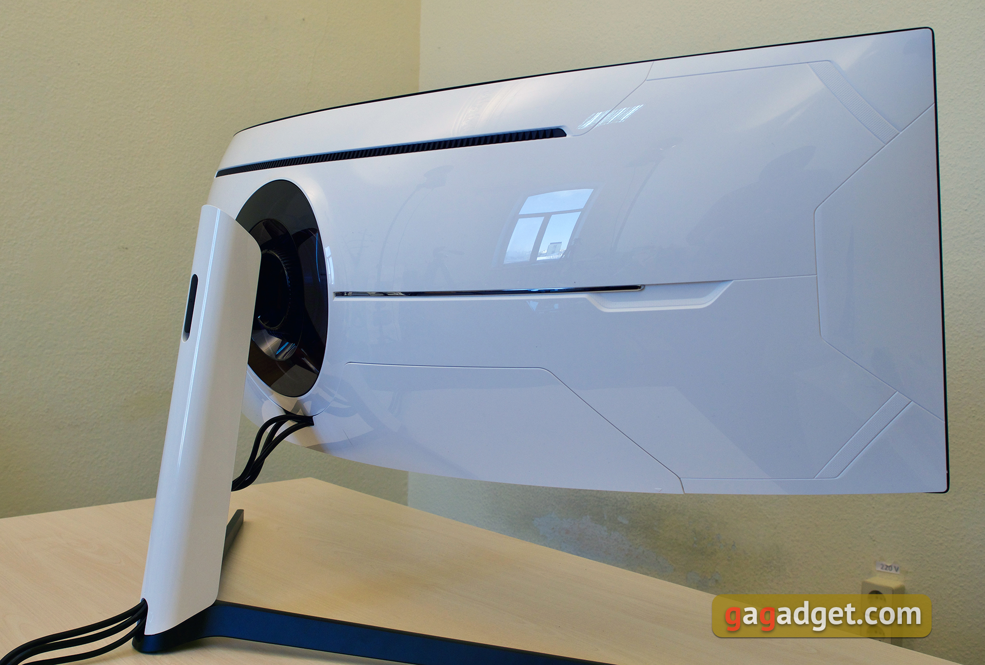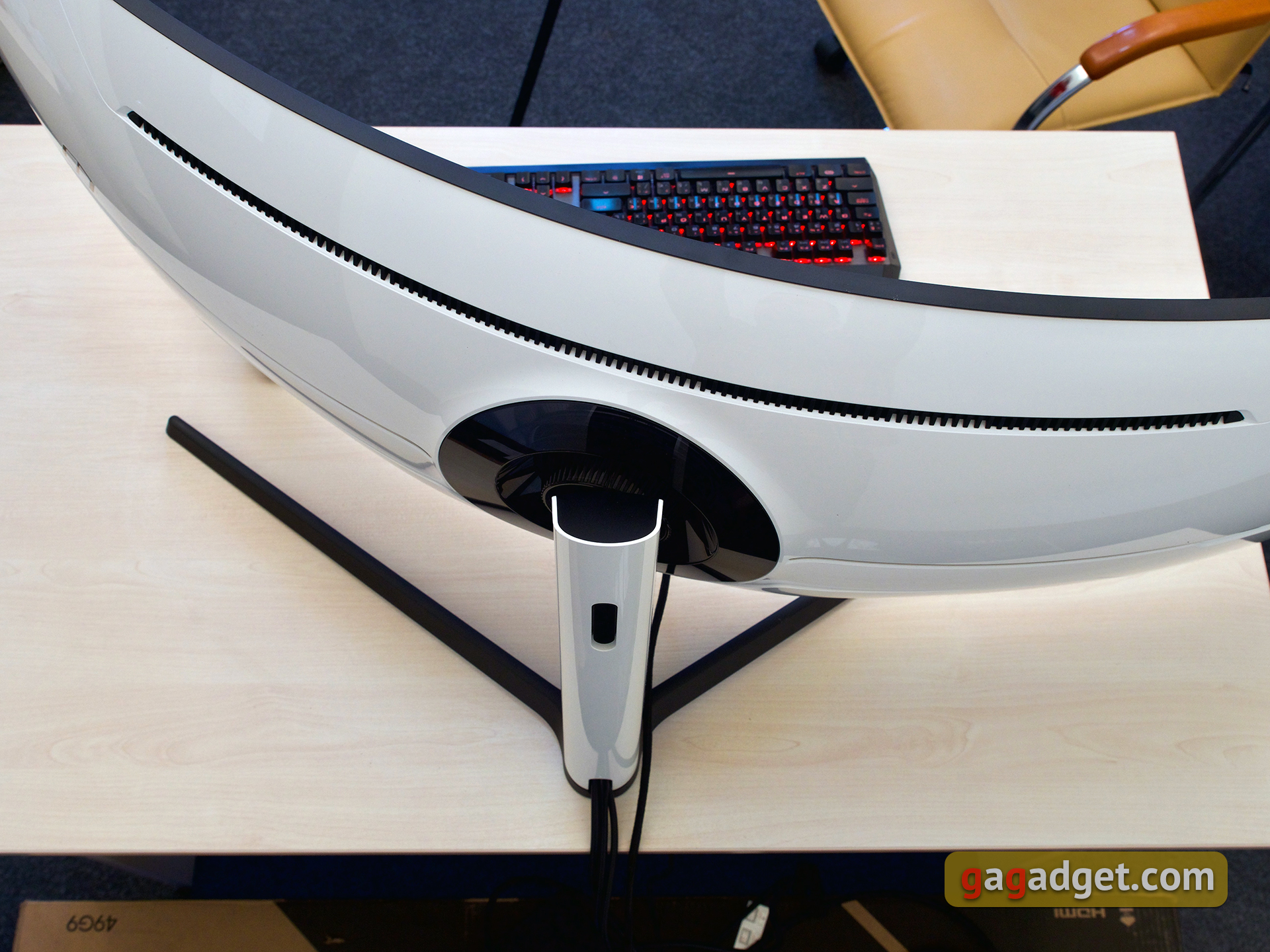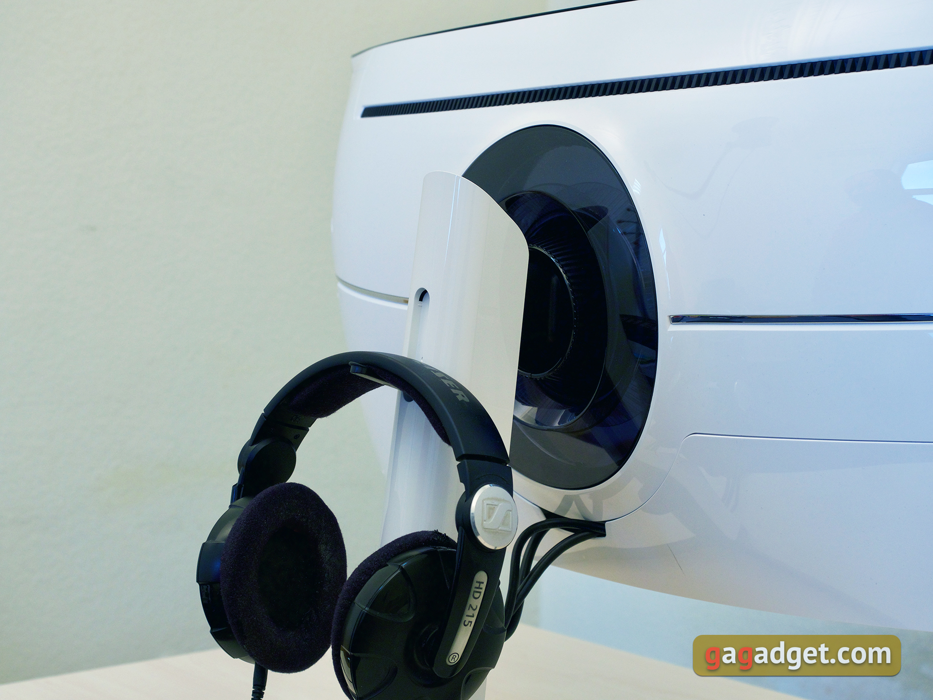 Podstawa ma kształt klina i bardzo imponujące wymiary i wagę. Mimo to monitor jest duży, konieczne jest zapewnienie odpowiedniej stabilności na stole. I nie tajemnicą jest, że do tego potrzebuje dużo miejsca. Dłatego przyszli kupujący muszą od razu pomyśleć nad wystarczającą ilością miejsca dla montażu.