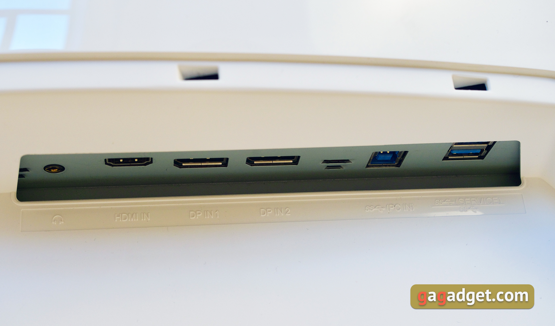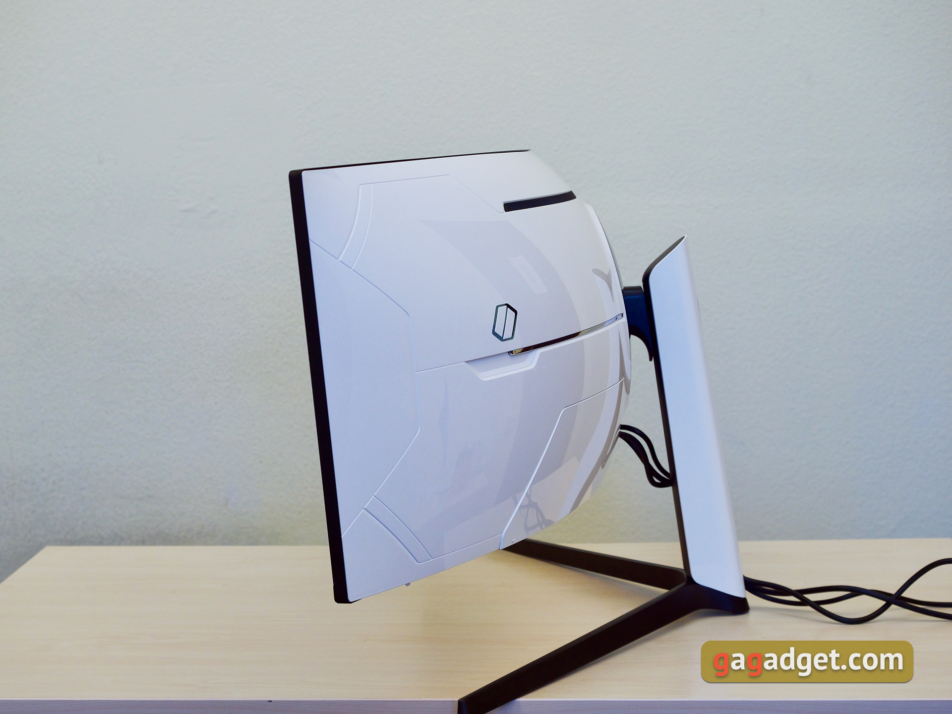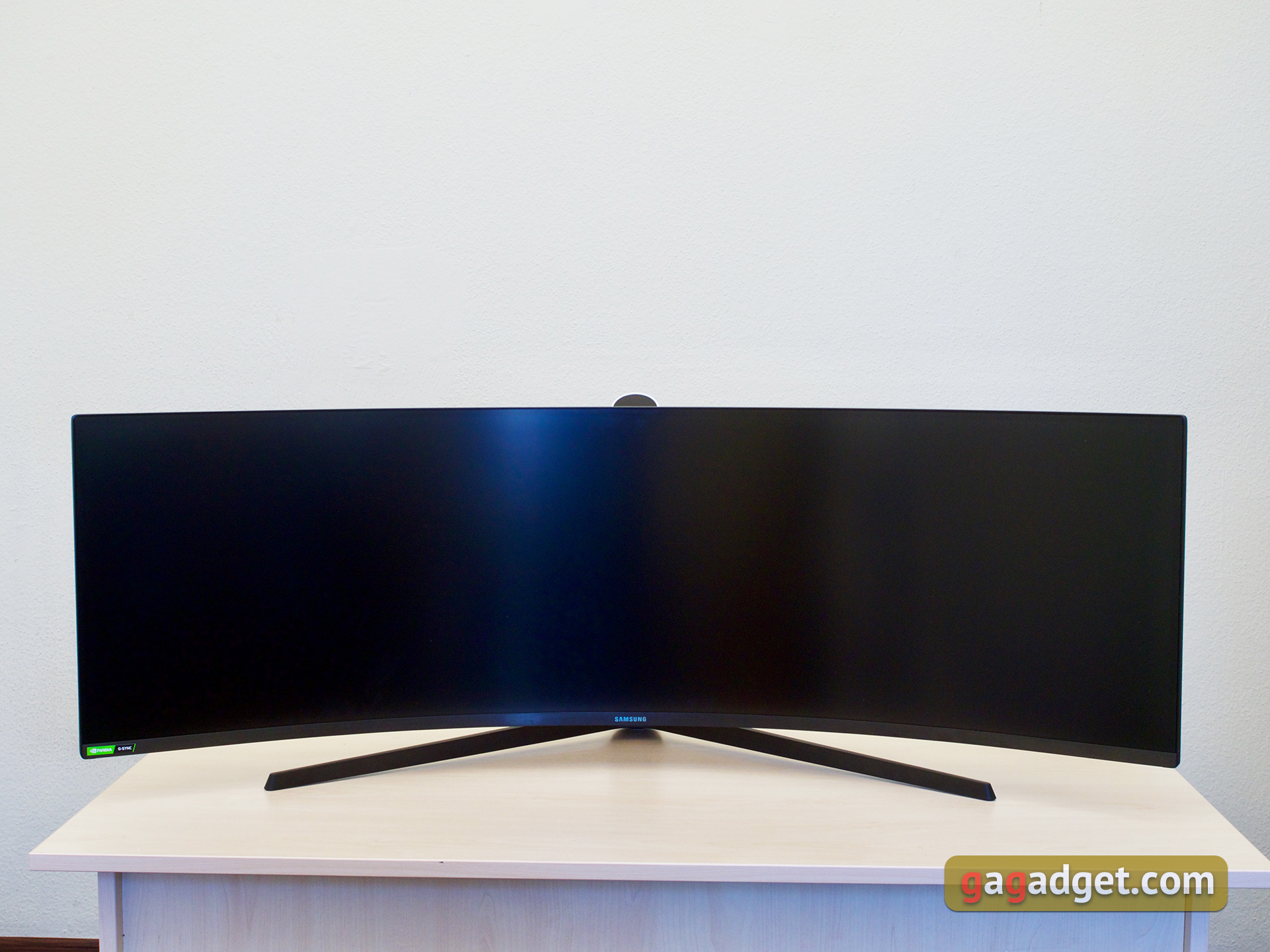 Podstawa ma kształt klina i bardzo imponujące wymiary i wagę. Mimo to monitor jest duży, konieczne jest zapewnienie odpowiedniej stabilności na stole. I nie tajemnicą jest, że do tego potrzebuje dużo miejsca. Dłatego przyszli kupujący muszą od razu pomyśleć nad wystarczającą ilością miejsca dla montażu.