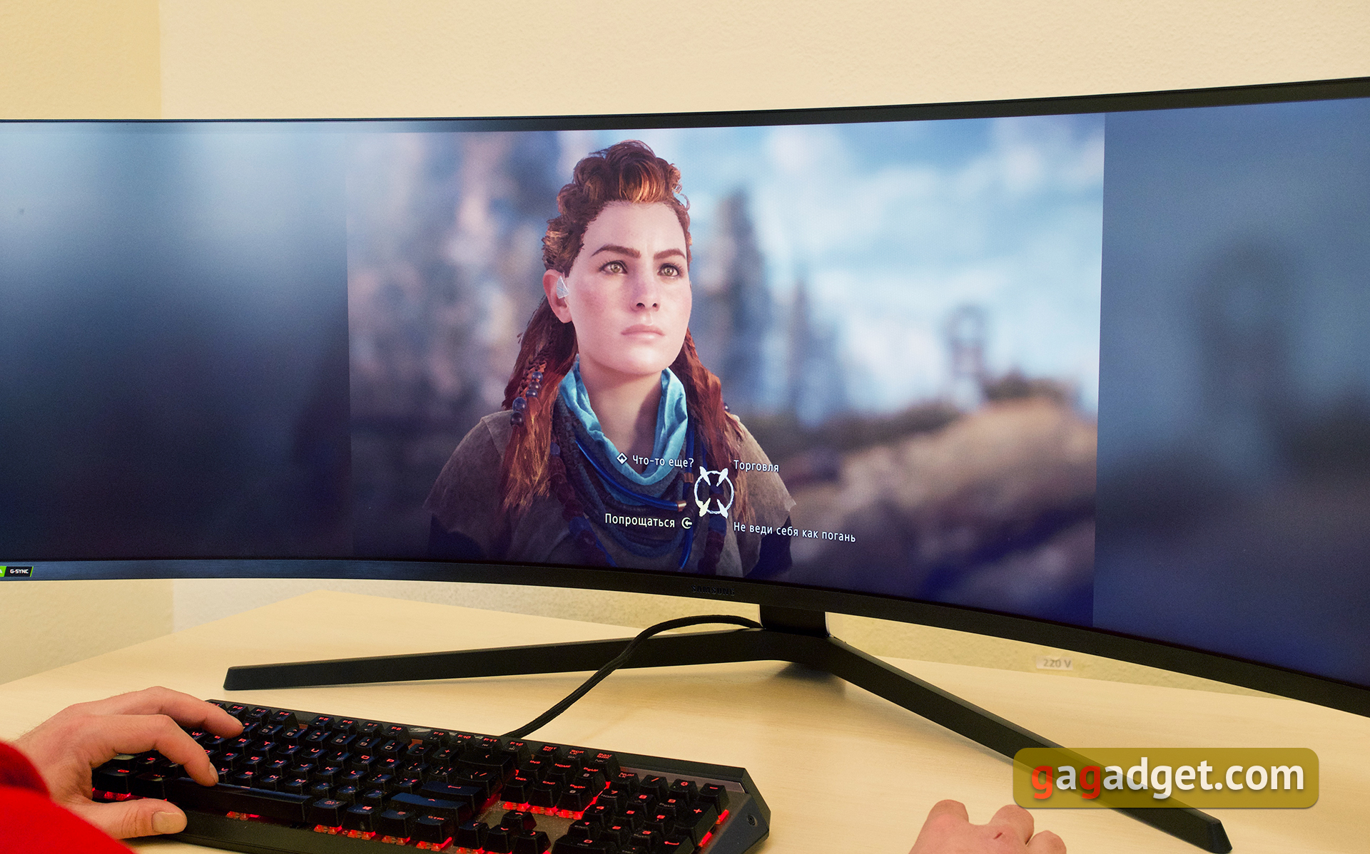 W większości przypadków wygląda to wszystko fajnie, chociaż wokół krawędzi występuje minimalny efekt rozmycia. Należy jednak rozumieć, że nie wszystkie gry wywołują efekt wow. Przede wszystkim taki monitor doskonale sprawdza się w FPS i symulacjach. Jednak zdobycie znacznie większej przestrzeni na strategię jest również bardzo przydatne. Większość nowoczesnych gier już obsługuje te „rozciągnięte” monitory, ale starsze gry będą miały czarne paski po bokach. A w niektórych grach z elementami wideo będą wyglądać mniej więcej tak:
